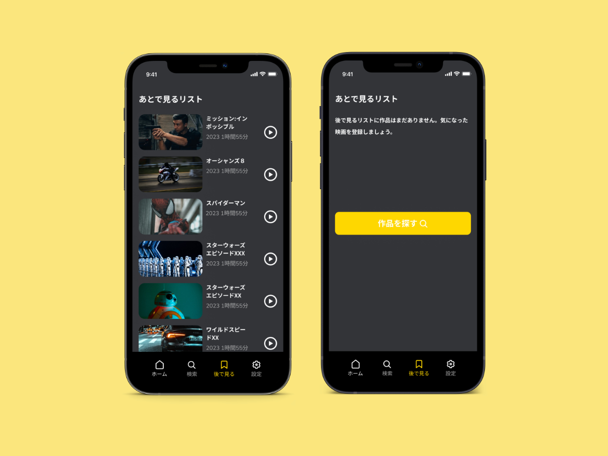 ・あとで見るリストは、一覧性を高くするため、既にリストに追加されている作品なのでユーザーがすでに興味を持っているため、再生ボタンを置いてすぐに作品を見始められる ようにしました。
