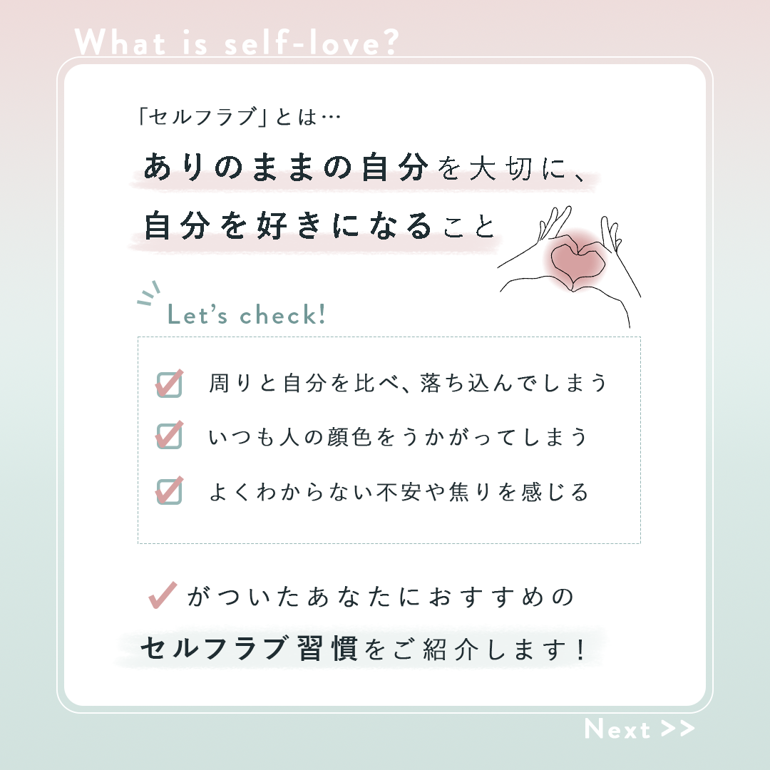 【自主制作】Instagram/X用バナー「自分を大切にできてる?セルフラブチェックリスト」 haru Webデザイナー OVERVIEW 2024.04.03 <目的>SHEをより多く知ってもらうため、SNSを通じてSHEターゲット層である女性に突き刺さるコンテンツを発信したい<ターゲット>・20代~30代の働く女性・仕事もプライベートもどちらも充実させたい<掲載場所>instagram/twitter