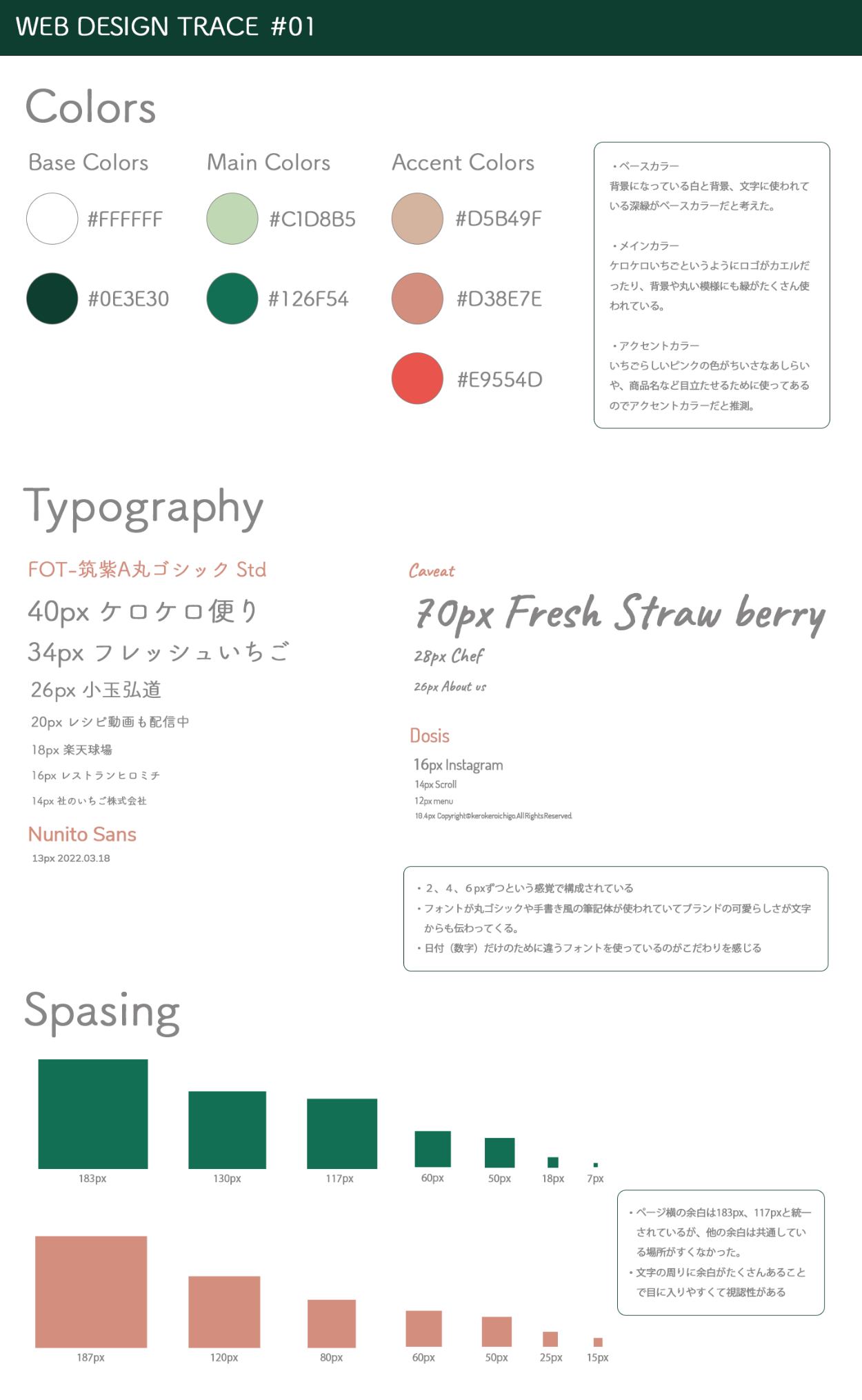 ・文章などの小さい文字が黒ではなく、深緑を使っていることでページが暗くならず雰囲気に合っている。また同じ深緑が一部背景にも使われているため、統一感が出ている。