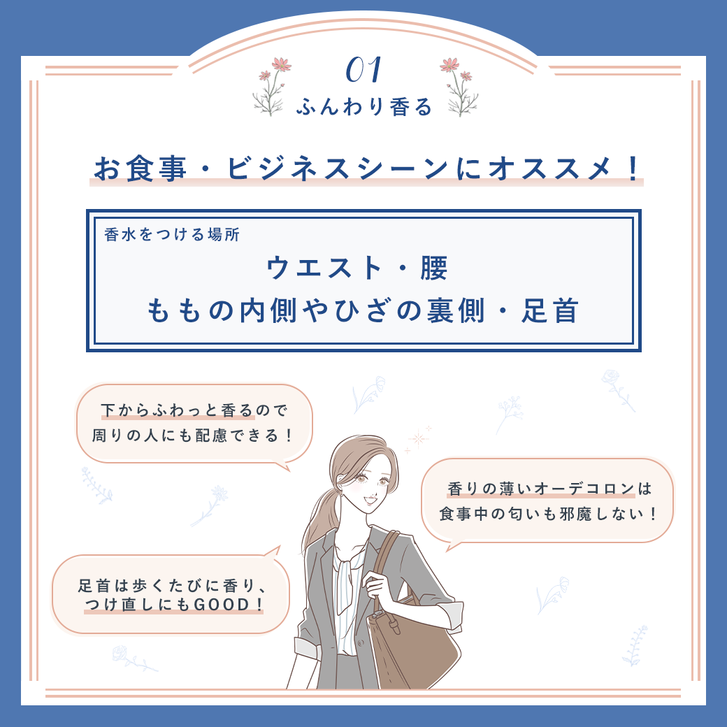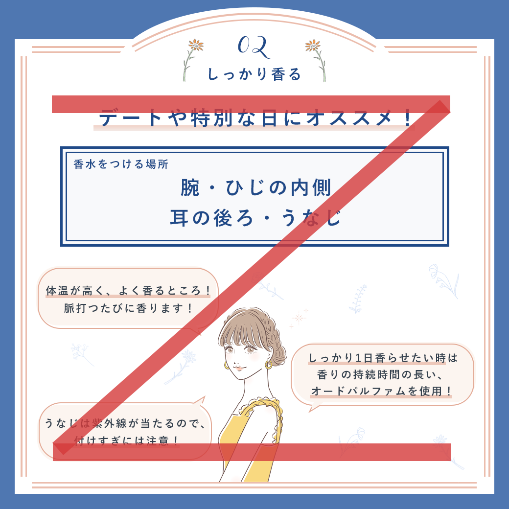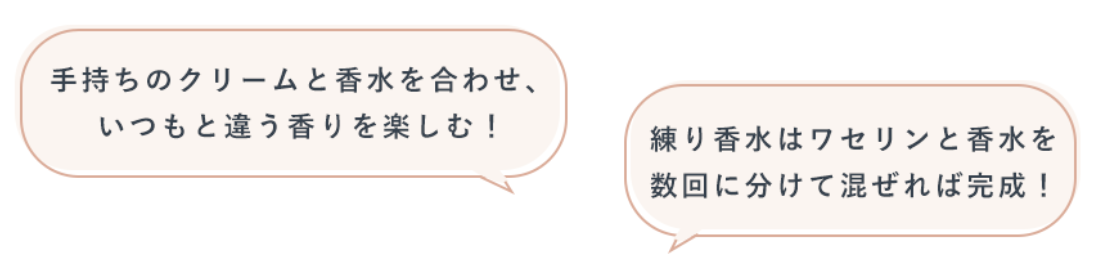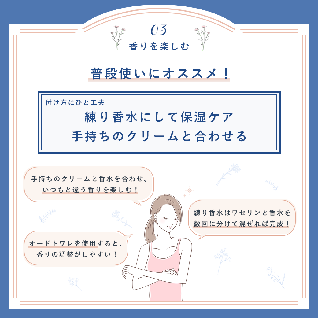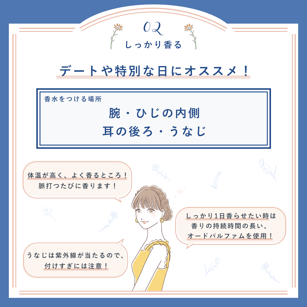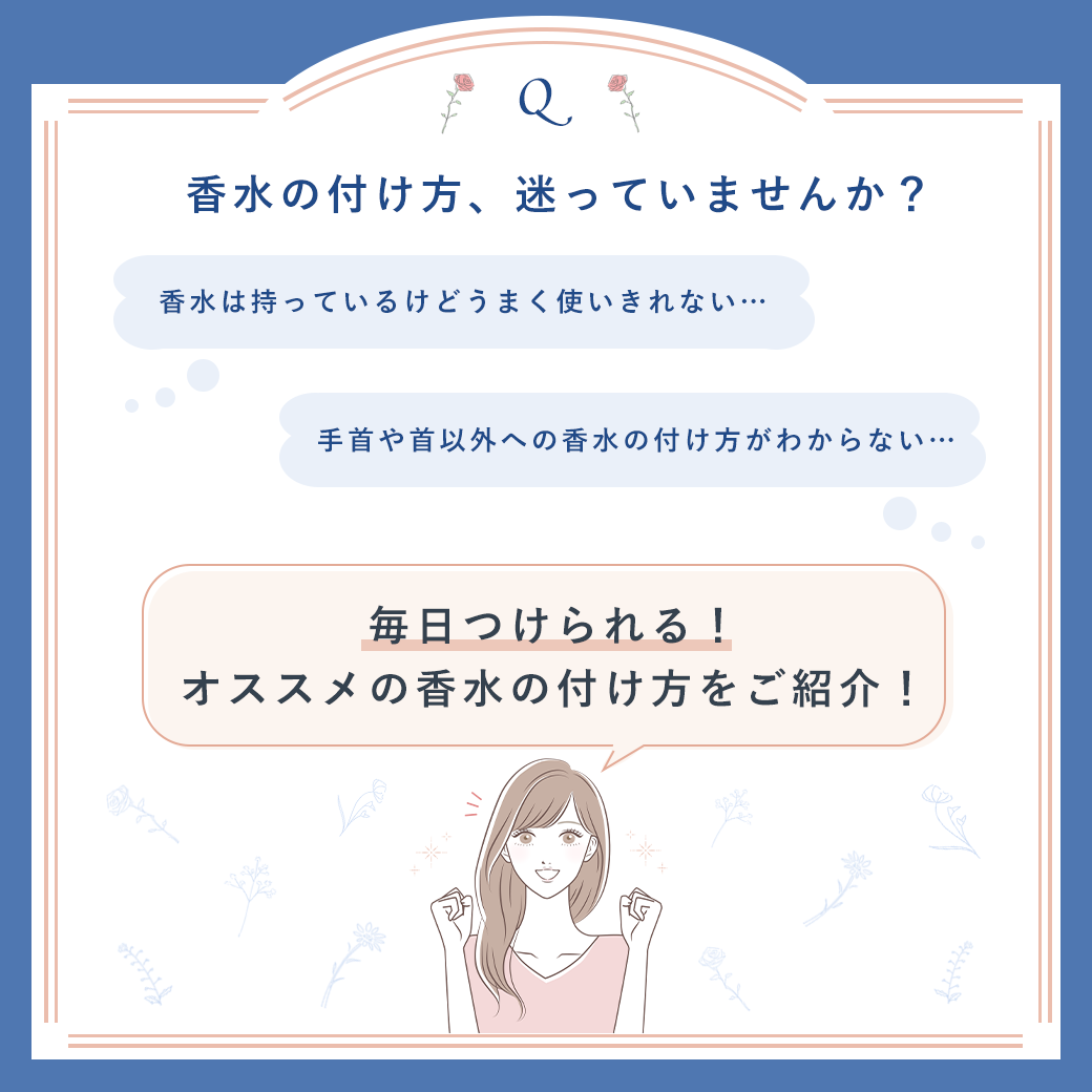 私自身が香水を購入した際に、販売員さんからお伺いしたオススメの使用方法もいれ、インターネット上ではあまり見ない情報も取り入れるようにしました。