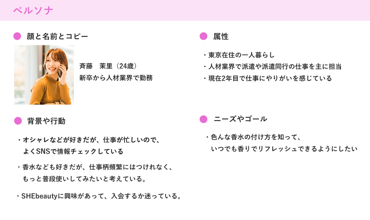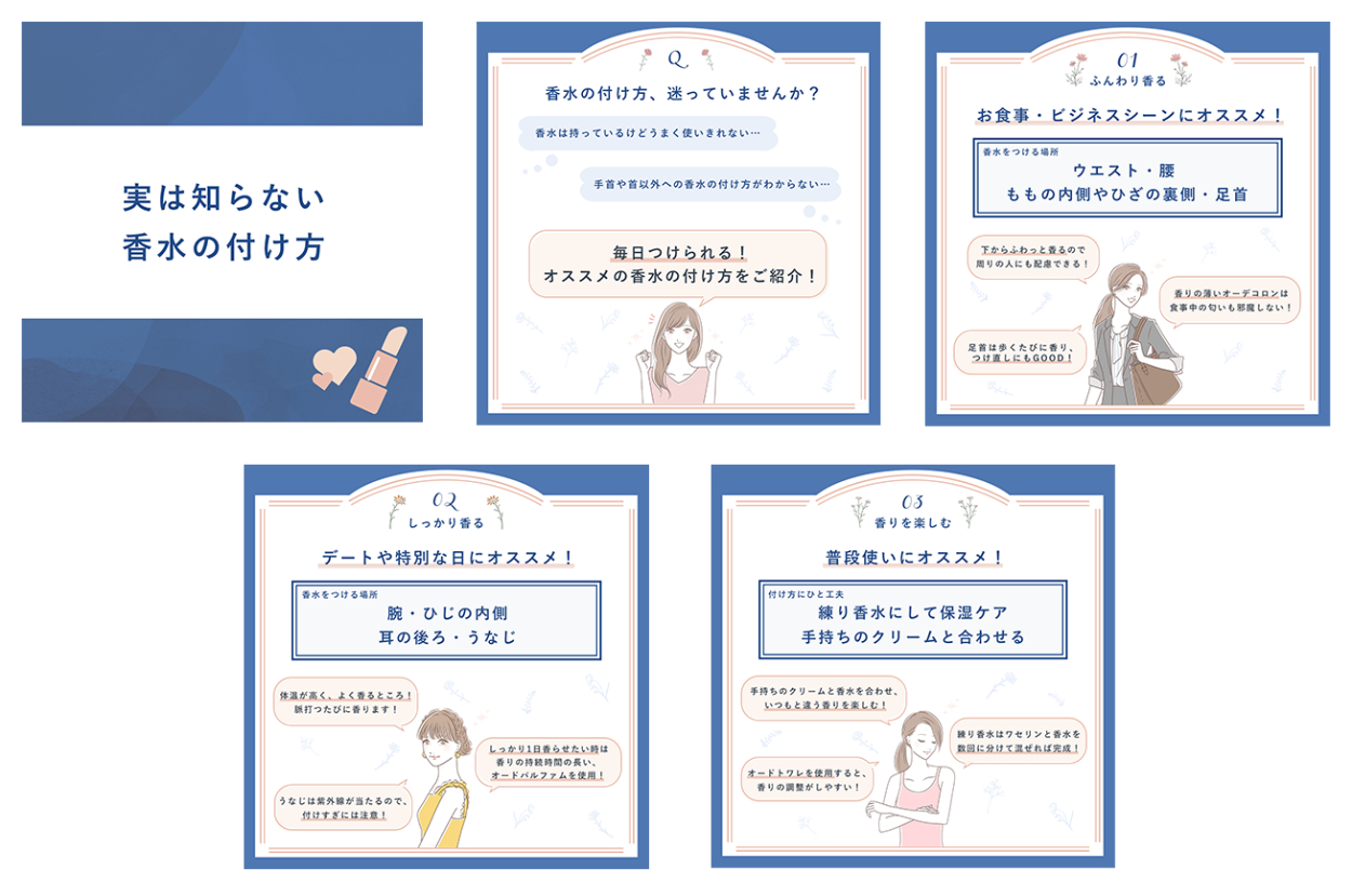 テーマが「実は知らない香水の付け方」で、香水は持っているが使い切りすることができない、またSNSに掲載するため頻繁にSNSで美容情報をチェックすることの多いペルソナを設定し、どんな情報デザインや情報が欲しいか考えながら制作しました。