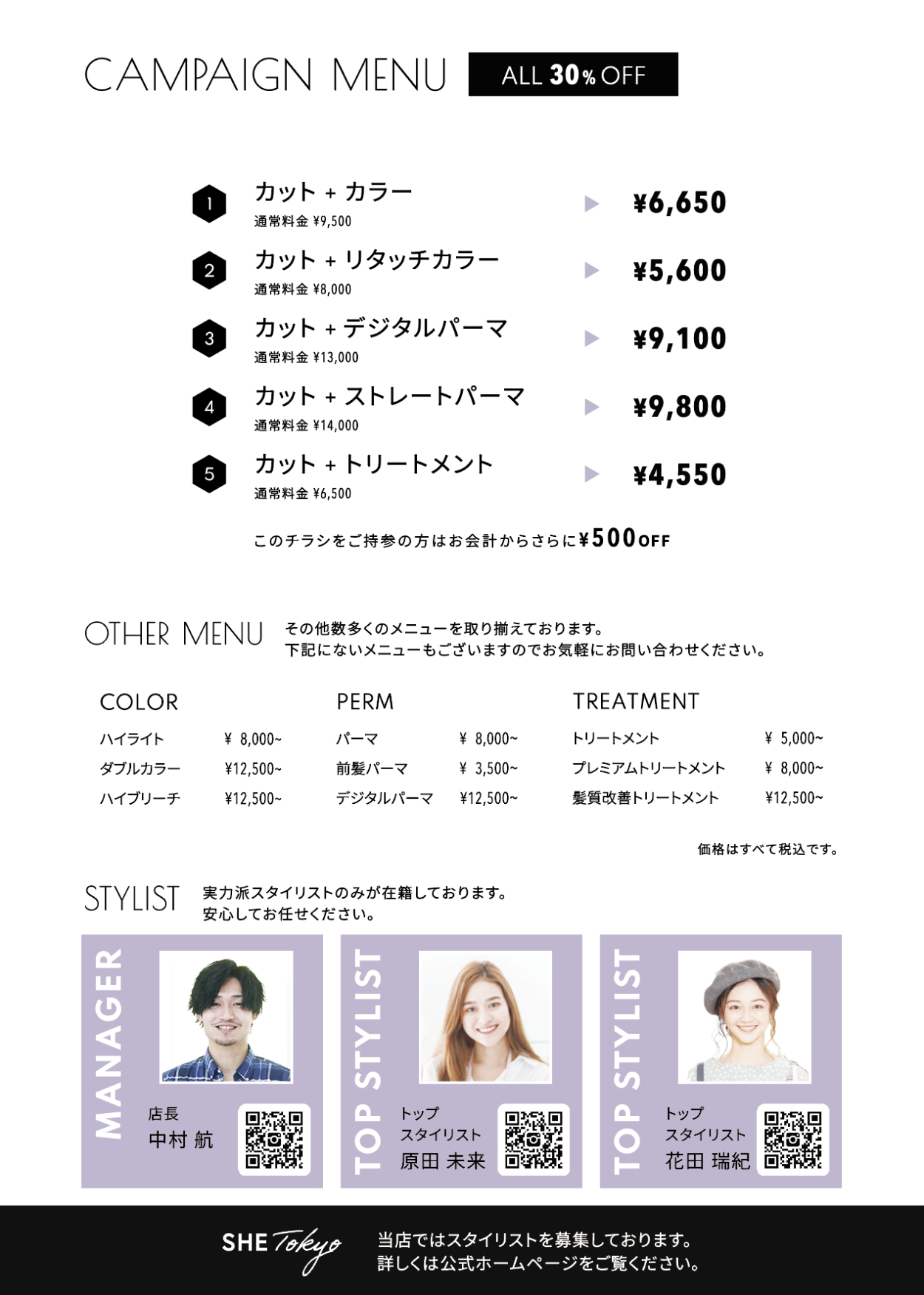 【架空】美容室フライヤー制作 小林 敬子 フリーランス OVERVIEW SHElikes MULTI CREATOR PROJECTで架空の美容室フライヤー制作課題に取り組みました。 使用ツール:Illustrator 制作期間:2週間 YEAR 2020
