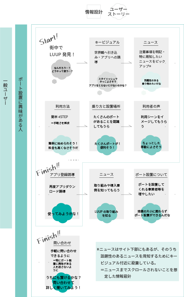 ・課題の項目としてはなかったサイトの情報設計の流れとそれに対するユーザーストーリーを分析する項目を設け、まとめました。