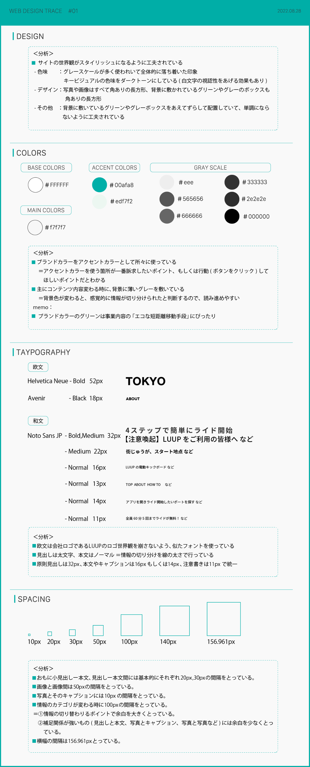 ・スタイルガイドの考察にDESIGNという項目を独自に増やし、デザイン全体の方向性の考察をしました。