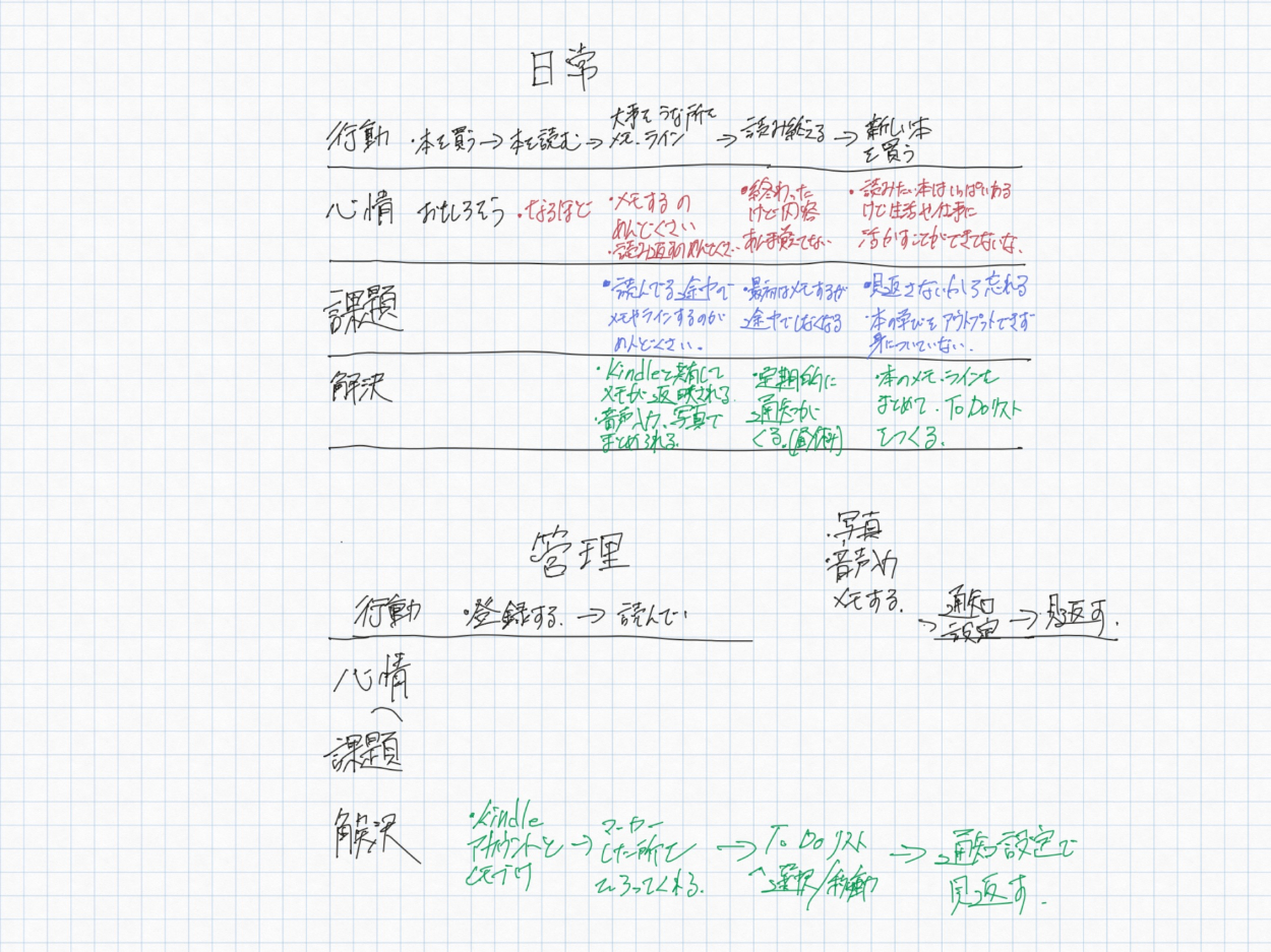 行動フローからメモは面倒で極力簡単にできることを考えると録音、画像から文章読み取り機能があると良いかも。メモしたい時に常にペンやマーカー、 ポストイットがある状態ではないのでこんな機能があると便利ではないかと考えました。