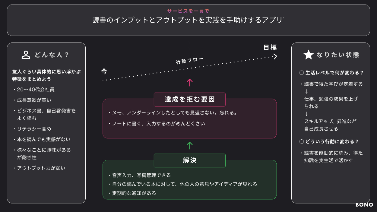 「読書のインプットとアウトプット実践を手助けするアプリ」