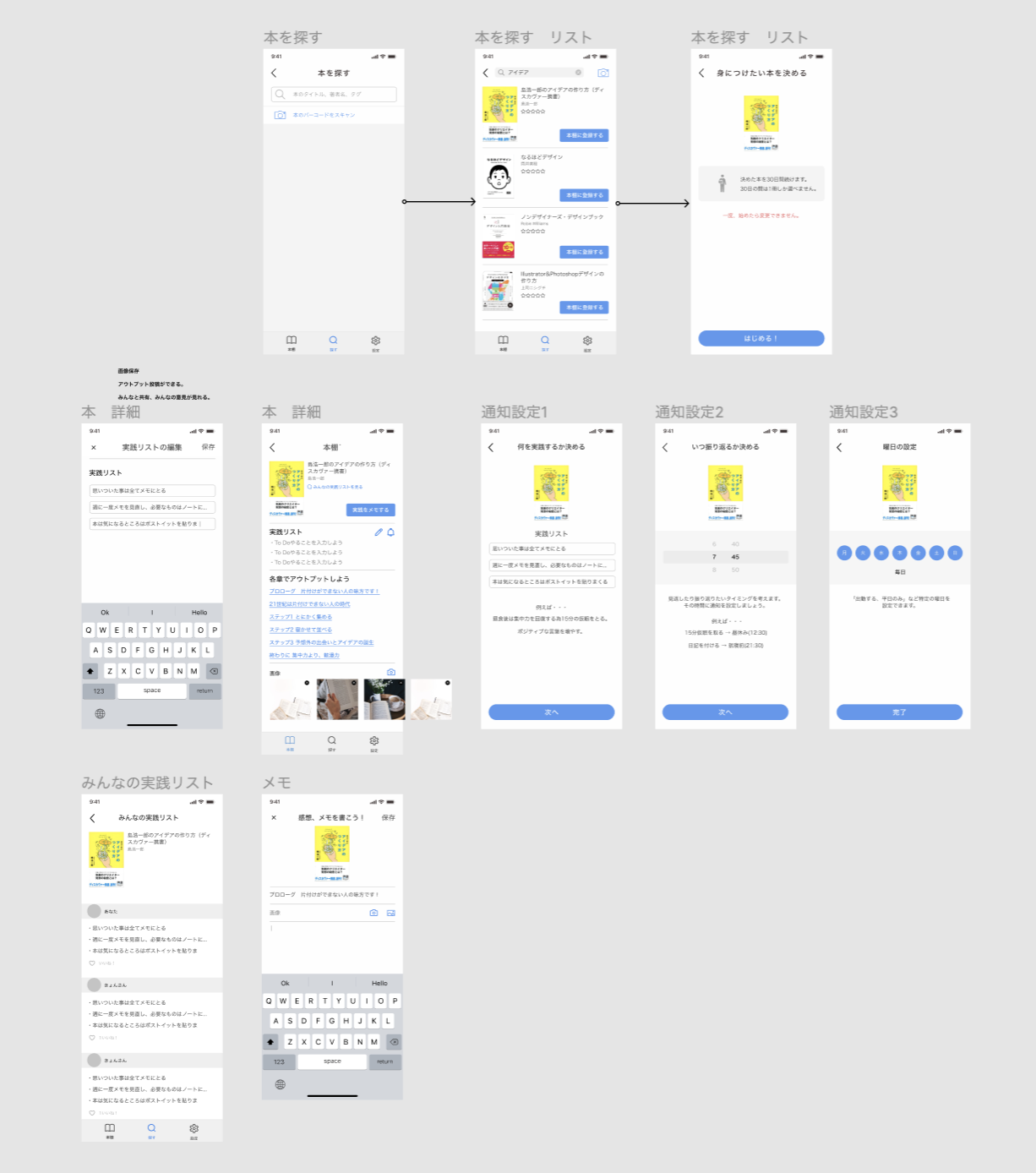 アイディアを出すために行動フローを作成しました。