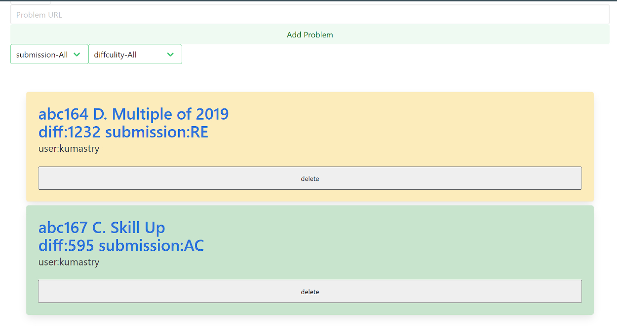 AtCoderの問題を解いているとき、問題ページのタブをたくさん開くのでそれを解消するためにAtCoderの問題を一元化するWebアプリを作成しました。