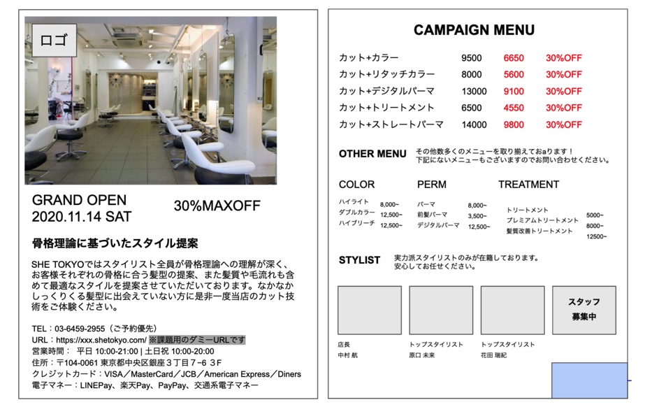 SHElikes MULTI CREATOR PROJECTの課題で、骨格理論に基いたスタイル提案が売りの美容室の特別キャンペーンフライヤー制作に取組みました。 制作時間:10時間 使用ツール:Illustrator、Photoshop