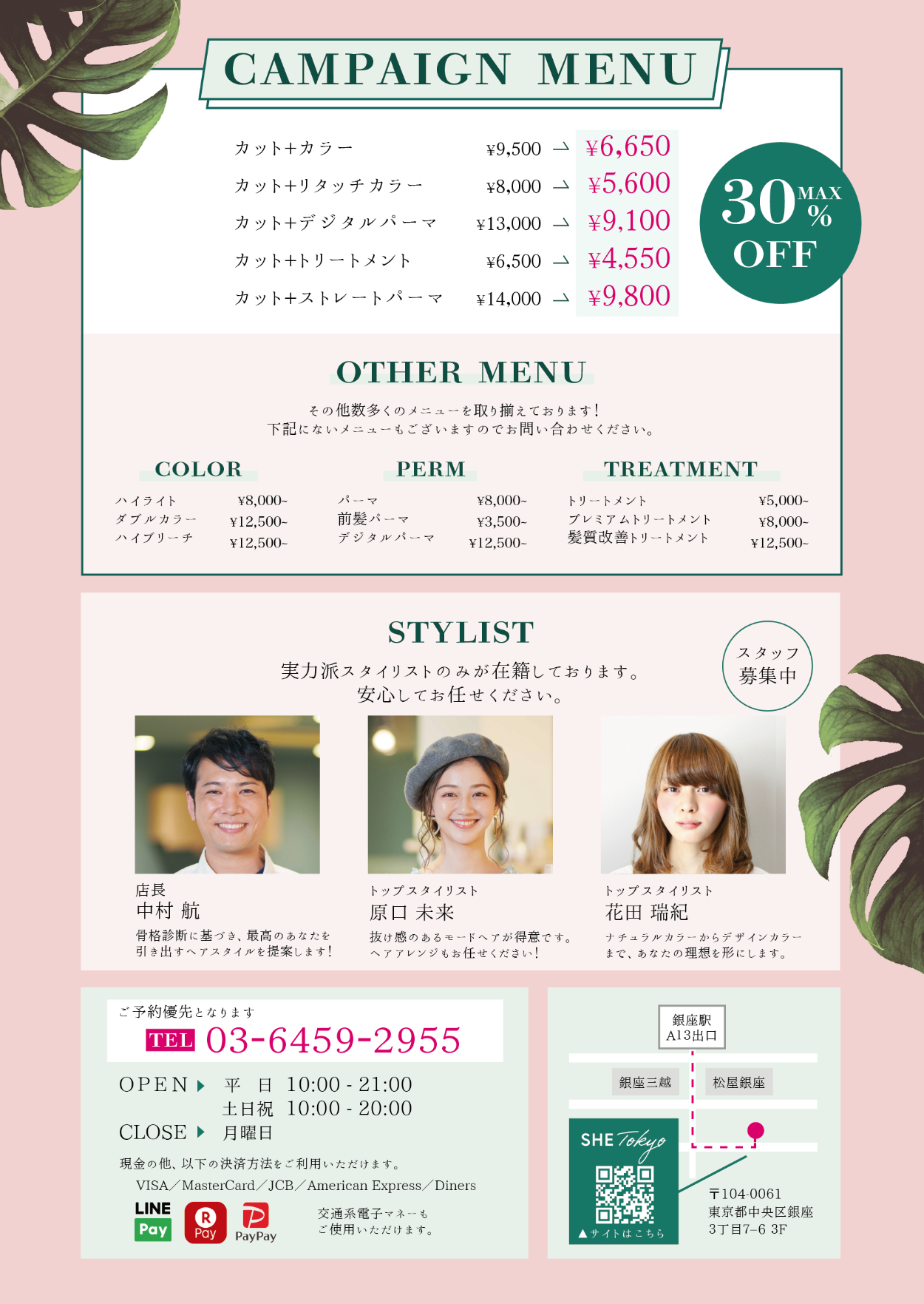 ・ターゲットは、値段よりも技術やクオリティを求める方であるため、値段の情報よりも美容室のこだわりや世界観が伝わるデザインとしました。所在地が銀座でもあることから、上品でありつつ、現代っぽさを感じられる、ナチュラル、ボタニカルな世界観を設定しました。