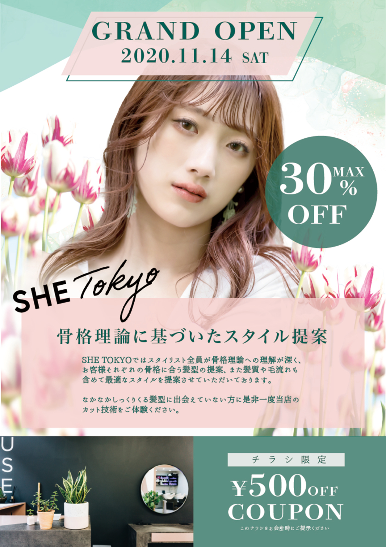 ・美容院のオープンを告知するフライヤーであるため、「GRAND OPEN」の文字を目立つ位置に配置しました。。かつ、文字サイズを大きく、文字間をゆったりめに調整することで、より目に入りやすいよう工夫しました。
