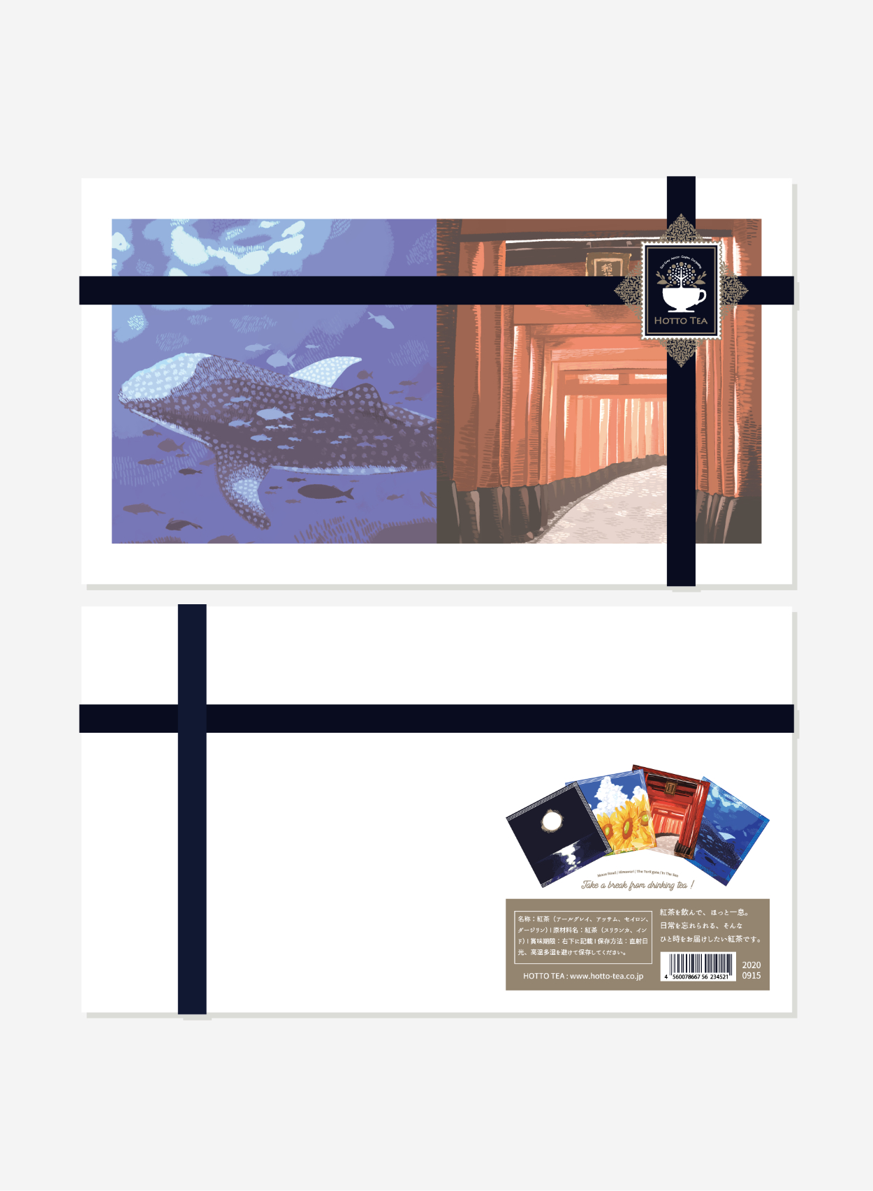 そして海の青と鳥居の赤、ムーンロードの月とひまわり畑の太陽がそれぞれ対になるようデザインし、綺麗だけど少し不気味さが感じられるようなパッケージにしています。