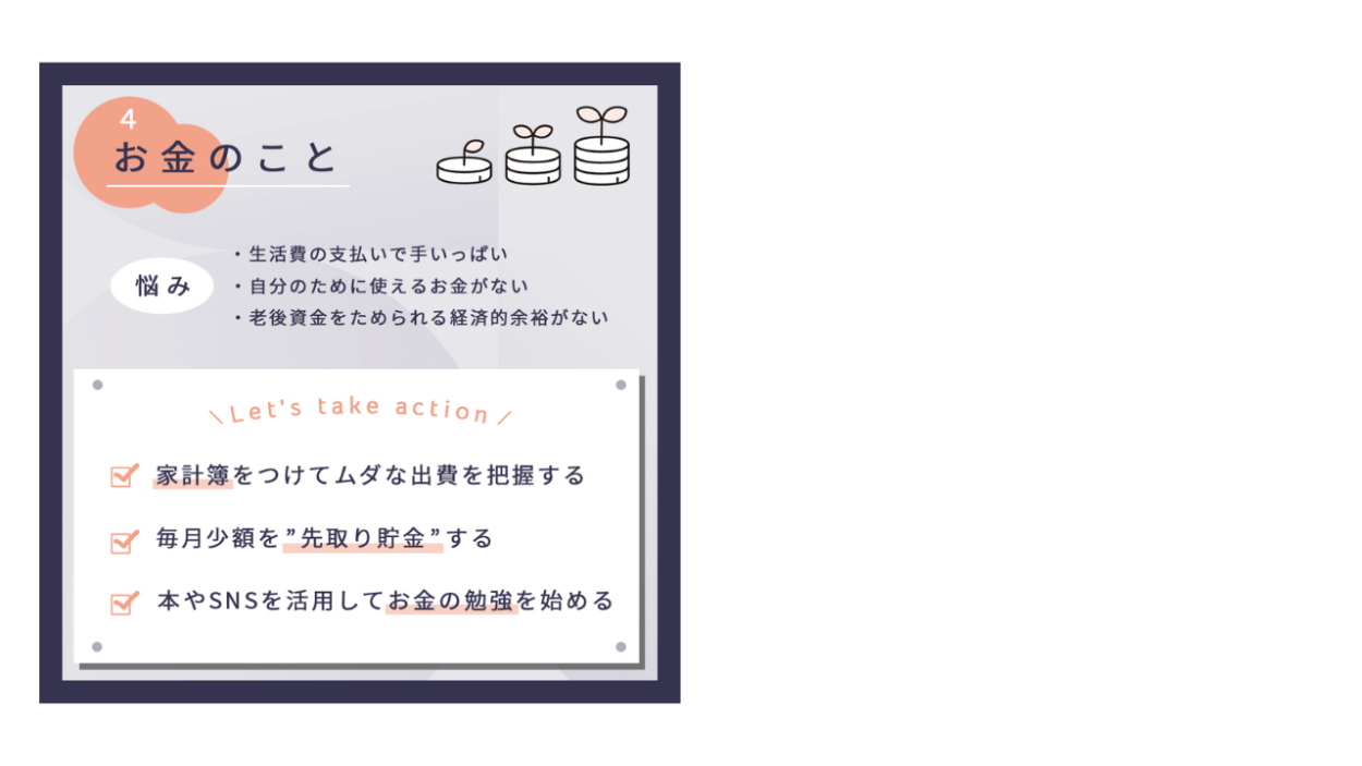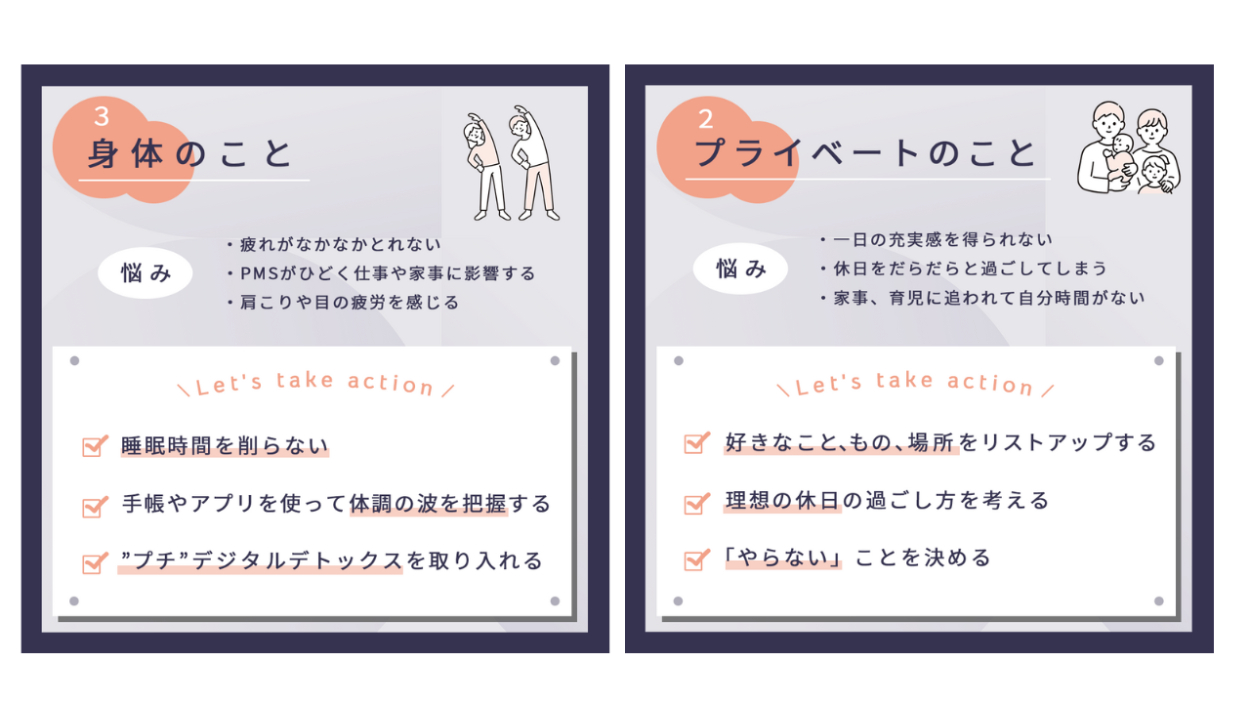 ・「悩み」と「Let's teke action!」の項目ごとでのグルーピングを意識しました