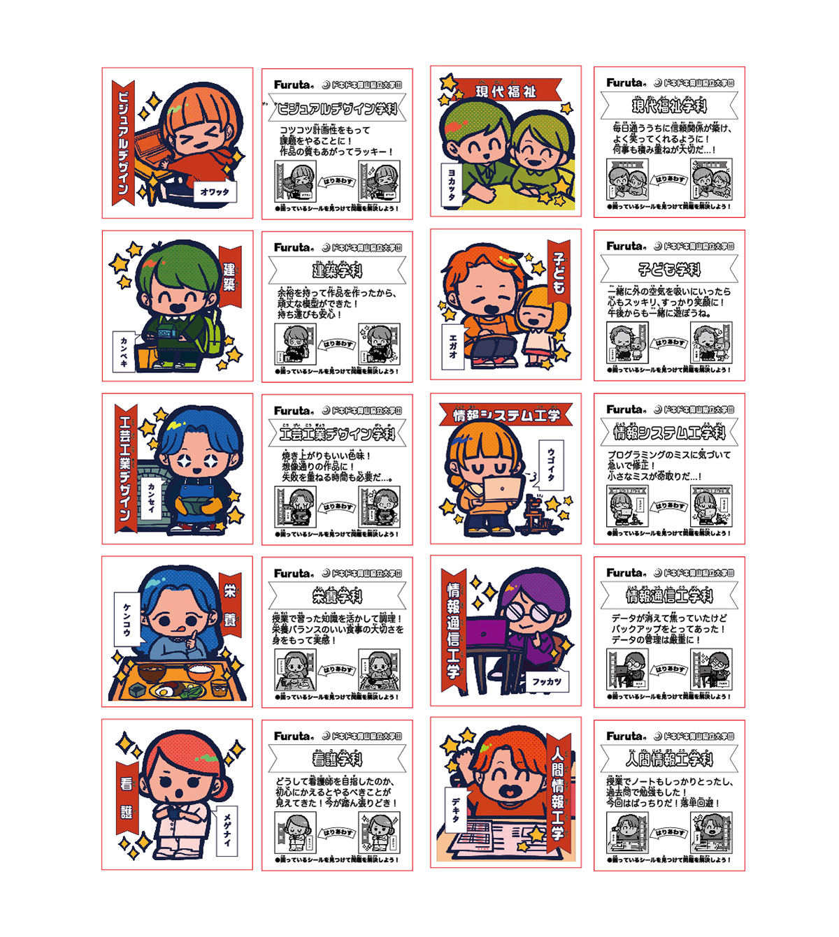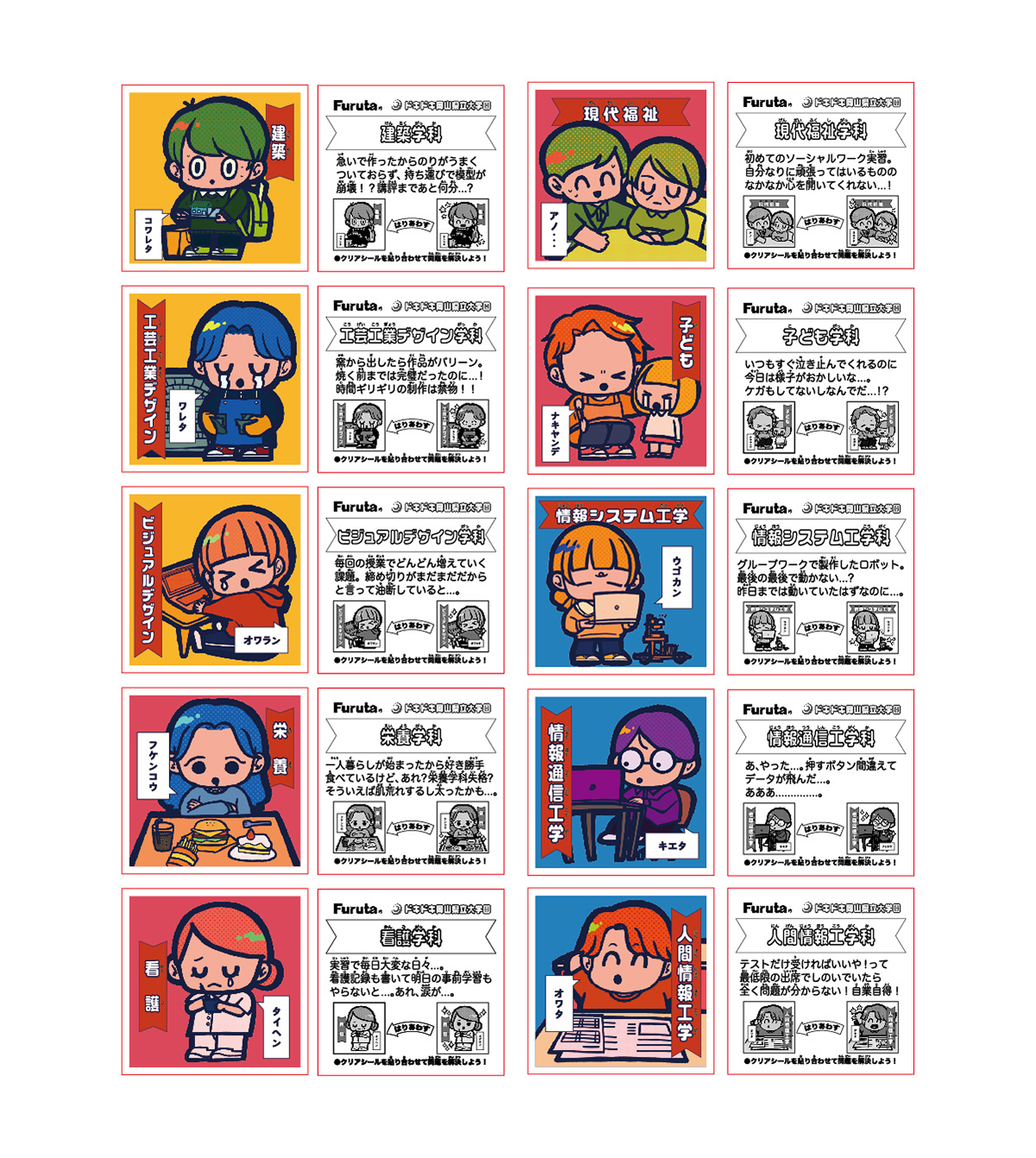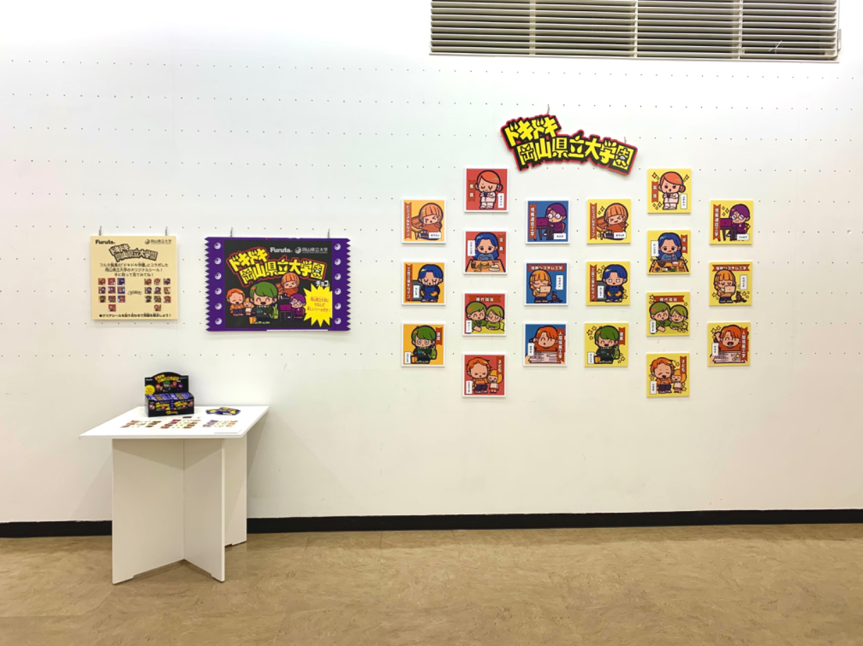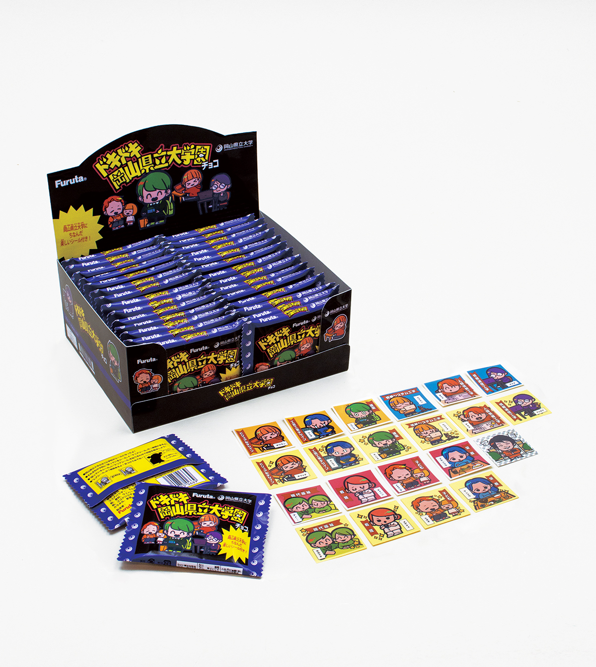 近年、大学の定員割れが問題になっています。今後入学希望者を一定数確保していくには、認知度と興味関心度の向上が必要です。そこで、現在でも根強い人気を誇る 「おまけシール」に着目しました。「おまけシール」の要素を用いればシールが大流行した世代である親世代にも、若い世代にもどちらにも興味を惹くものが作れるのではないかと考えます。そこで、大学PRを目的にし、フルタ製菓の協力のもと、「ドキドキ学園チョコ」と岡山県立大学のコラボによる「おまけシール」を制作しました。