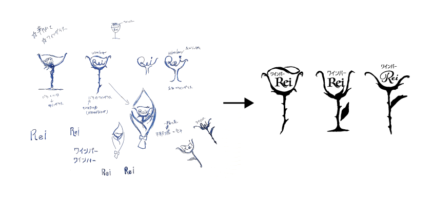 オーナーさんのもつイメージから薔薇を連想し、薔薇をワイングラスに見立て、ラフを起こしました(上画像)。