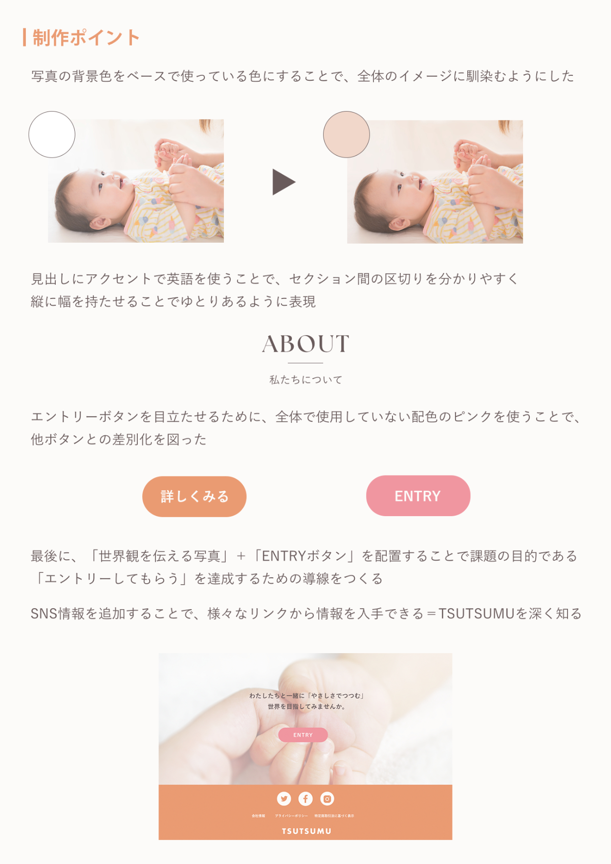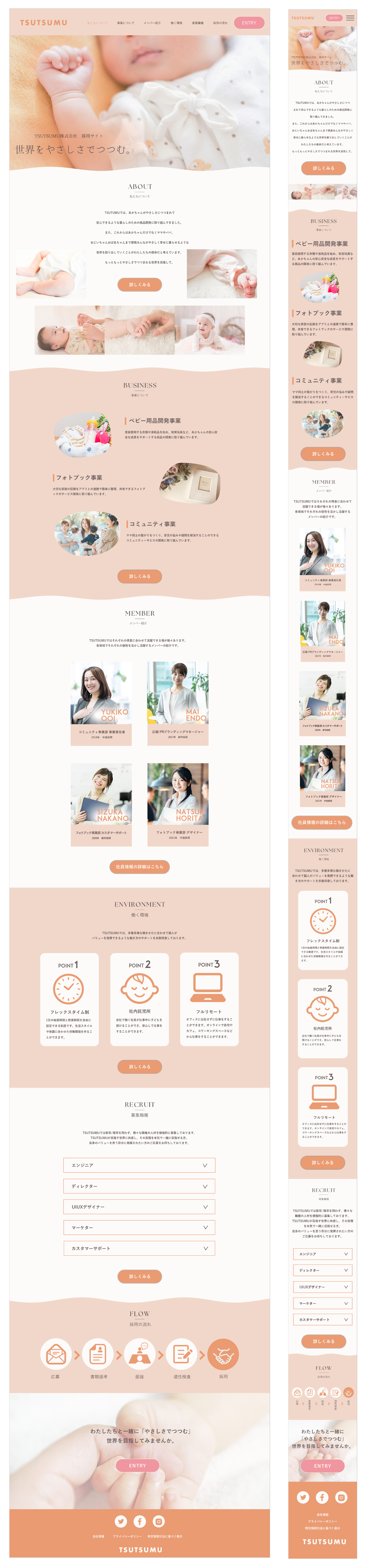 SHElikes MULTI CREATOR COUSEの課題で、LP制作に取組みました。ベビー用品を扱う架空企業の採用サイトのデザインカンプからコーディングまでの制作を行いました。