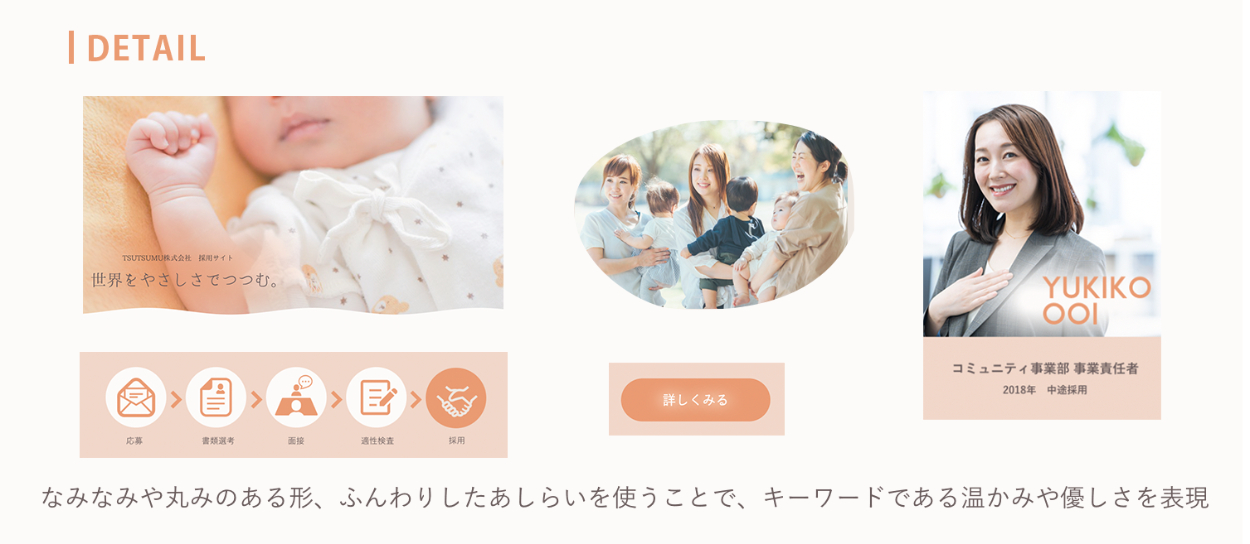 採用サイトなので、出来るだけ情報やあしらいをシンプルにするのと、余白を多めにとり、ゆとりのある見やすいデザインを意識しました。また、キービジュアルが波線を使用したり、ほんわかしているイメージで作成したので、その後の写真や背景についてもキービジュアルに合わせたデザインに統一しました。その中でも、採用サイトなので、見出しやメンバー紹介の部分などはきれいな透明感のあるデザインを心がけ、伝えたい情報の内容に合うデザインを意識して作成しました。