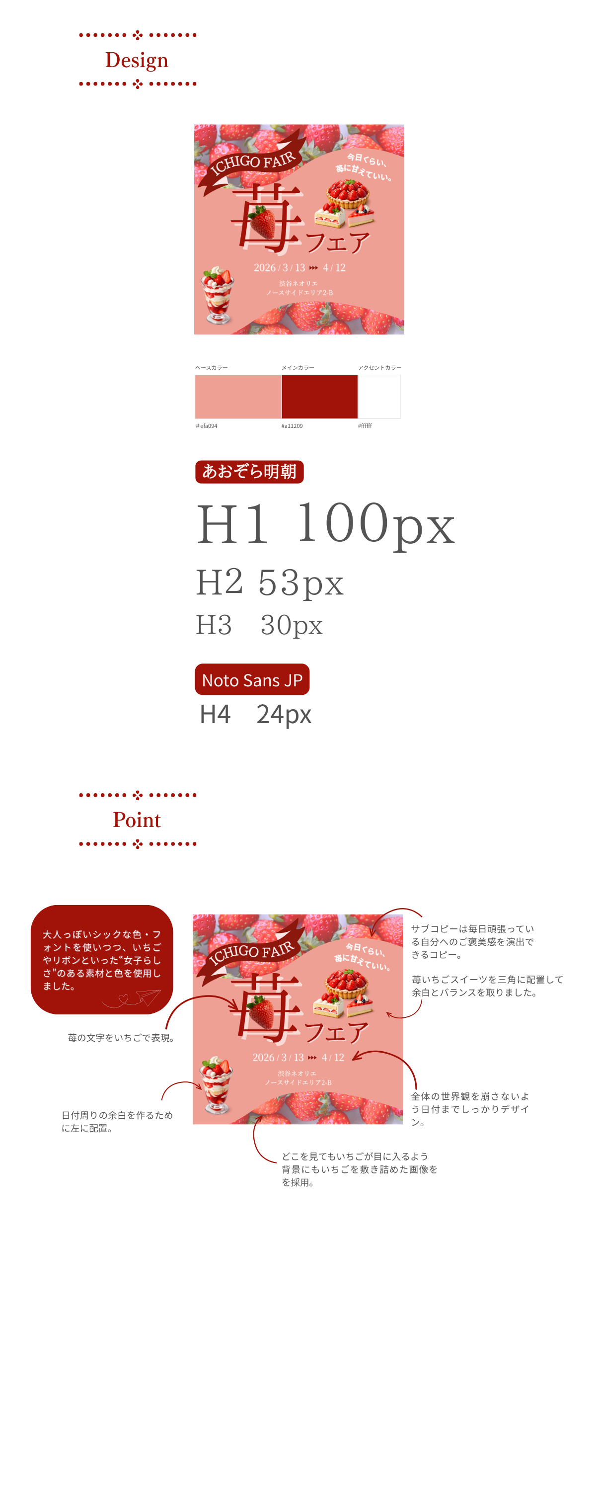 【HerTech架空案件】苺フェア広告バナー 鈴木しおり Webデザイナー OVERVIEW Canvaを使用してHerTechで架空案件のインスタ用広告バナーの作成をしました。 ▪️制作時間 4時間▪️ターゲット 20〜40代女性▪️目的 イベント集客