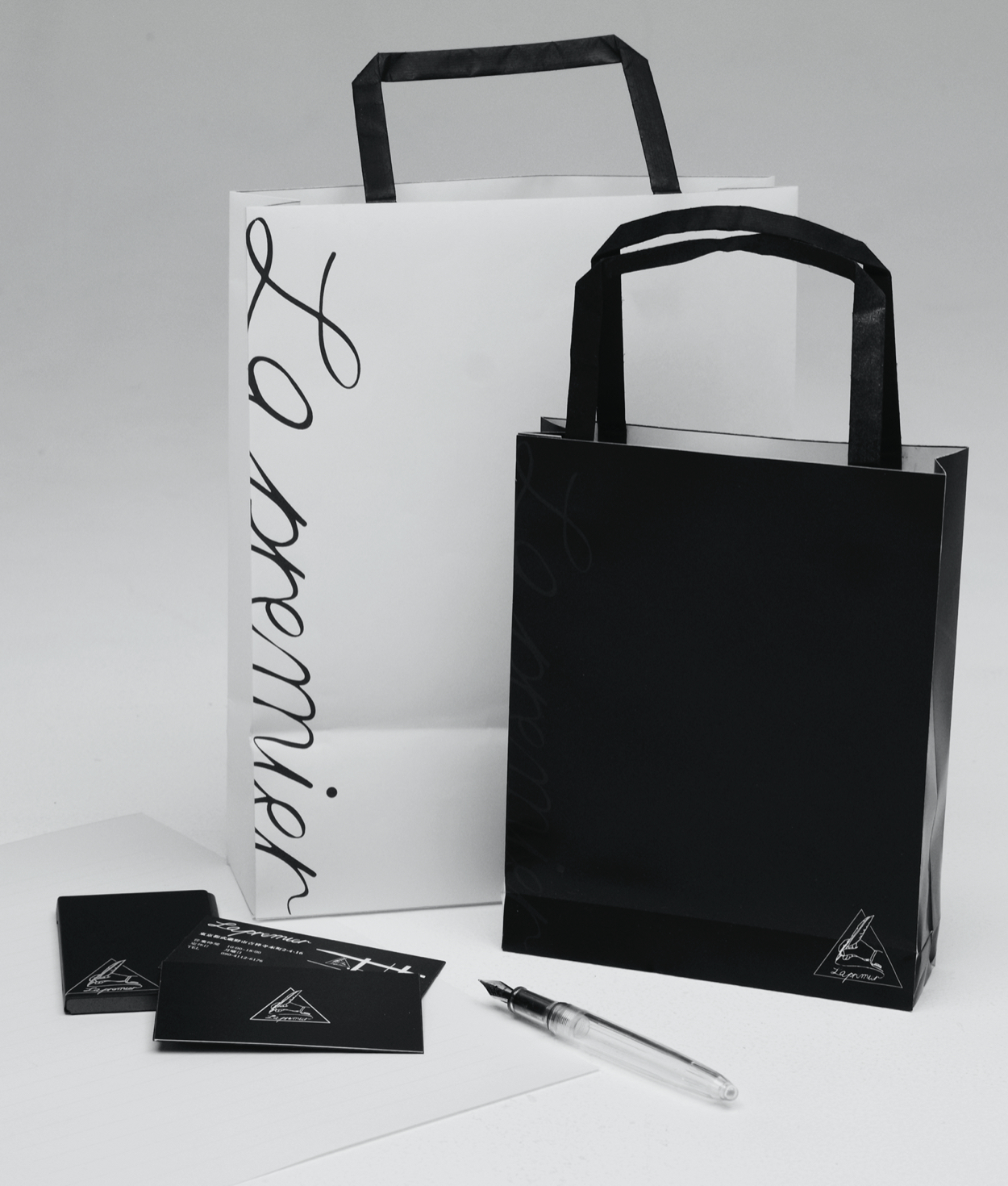 黒をメインカラーとして大人の高級感のあるお店を目指し、フォントとイラストを一筆書きで制作することで、万年筆のどこまでも書いていたくなるような滑らかな書き心地をイメージしました。