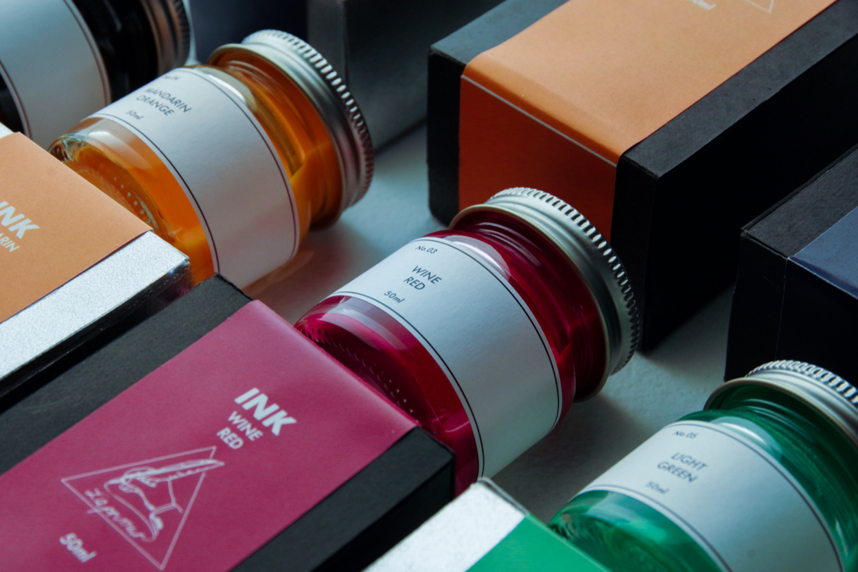 何種類もあるインクの中から手にとってもらえるような小ぶりで可愛らしさと上品さのあるインクのパッケージを考えました。