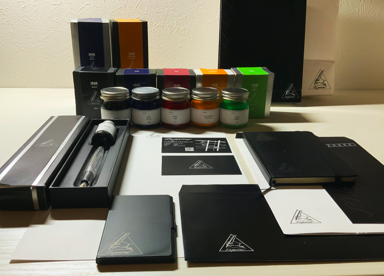 名刺、ショッパー、封筒、(名刺入れ、手帳にレーザーカッターでロゴを刻印)