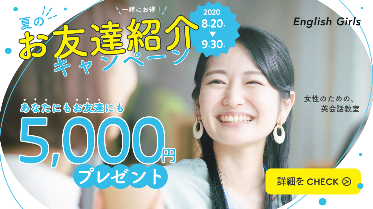 入れる文言▶①一緒にお得!②夏のお友達紹介キャンペーン③あなたにもお友達にも5,000円プレゼント④期間:2020年8月20日〜9月30日