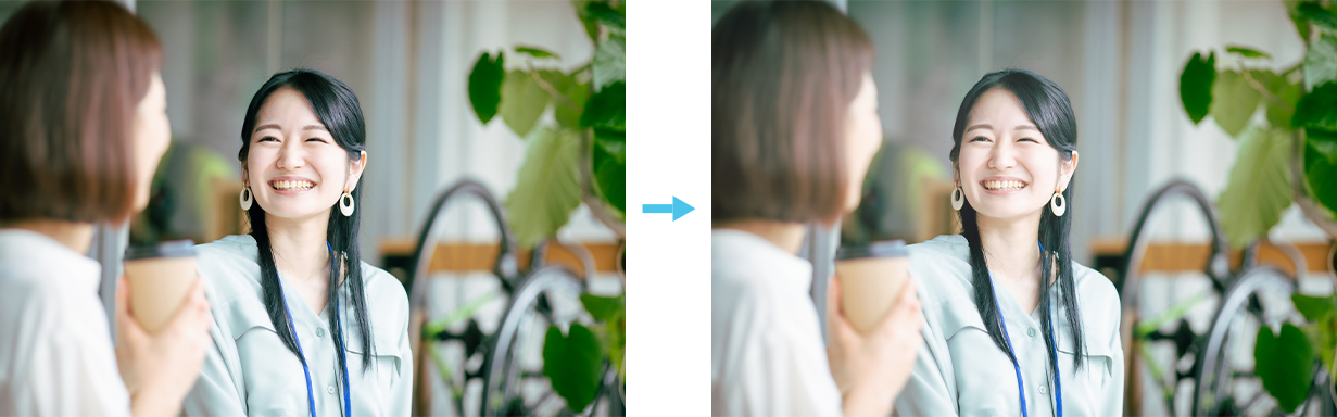 手前の女性の顔が映っていないものにすることで、奥の女性が自分に話しかけてきている様な、親近感を感じてもらえる写真を選びました。また、写真全体を加工し、ふんわりと優しい印象に仕上げました。