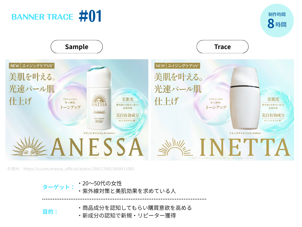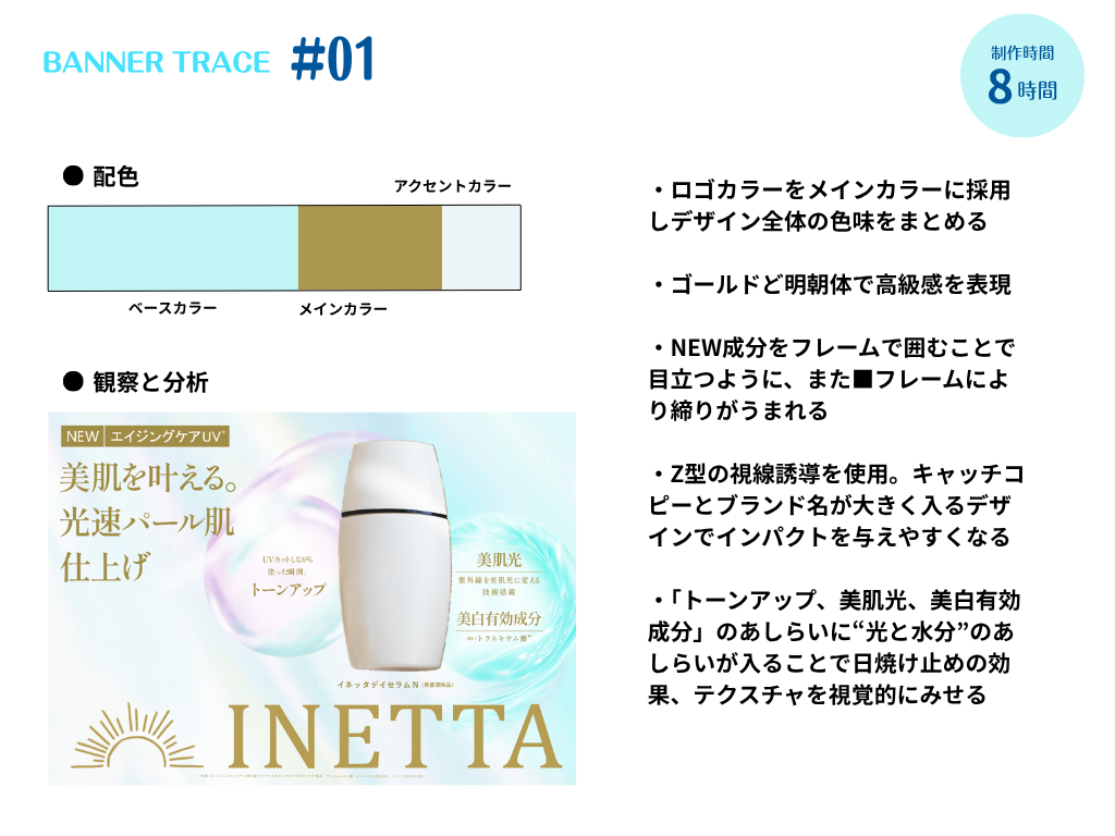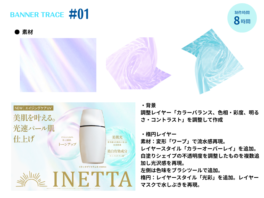 「トーンアップ」部分のあしらいに類似する画像がなかったため、1から作成しております。水しぶきや渦を描く表現など「水」「潤い」を出す練習は、今後のスキンケア・コスメなどのバナーに活用できるスキル習得ができました。