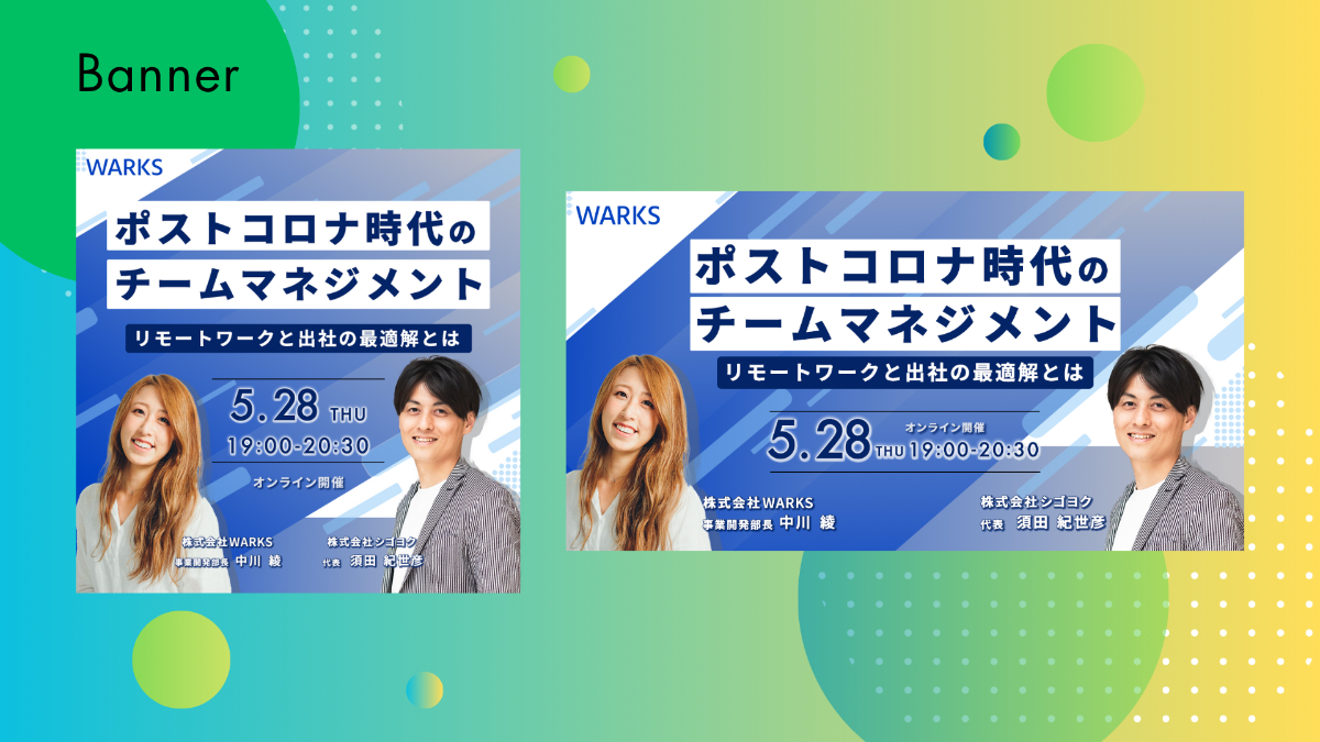 - 課題要件|企業に対して新時代のワークスタイルコンサルティングを行う株式会社WARKSがパートナー企業である株式会社シゴヨクと共同主催するオンラインセミナーの告知と集客。バナーを見た人がイベントに申し込みをする。