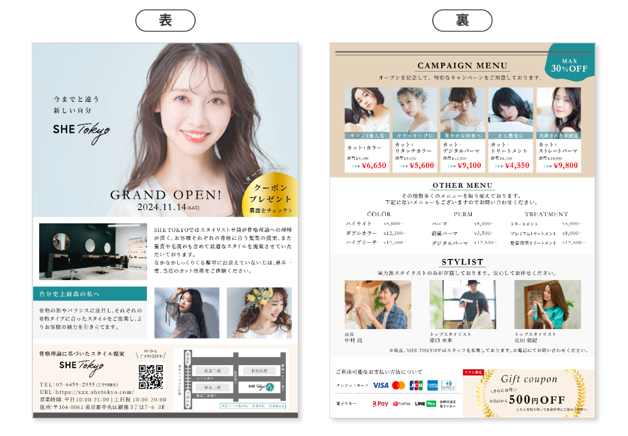 オープン記念キャンペーンの実施を通し、美容院の認知の拡大と新規顧客の獲得を目指す。新店舗(銀座)オープンに向けたポスティング用のフライヤーを制作する。