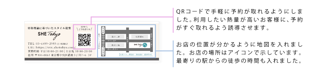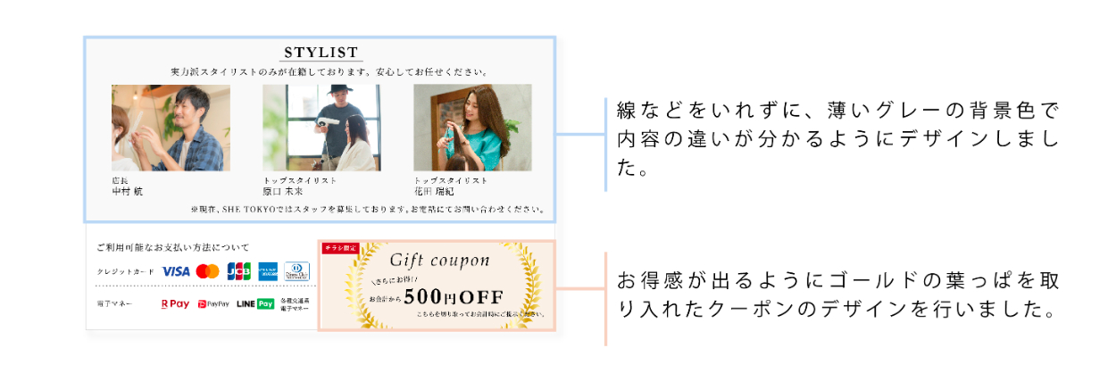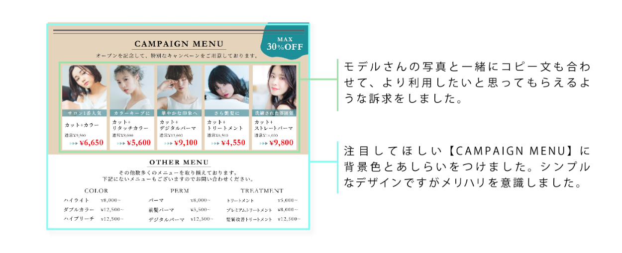 与えられた情報からどんな人が利用しそうかということやサロンを利用したら、こんな風になるというイメージがしやすいように、写真や言葉をうまく組み合わせてデザインすることの大切さを学びました。