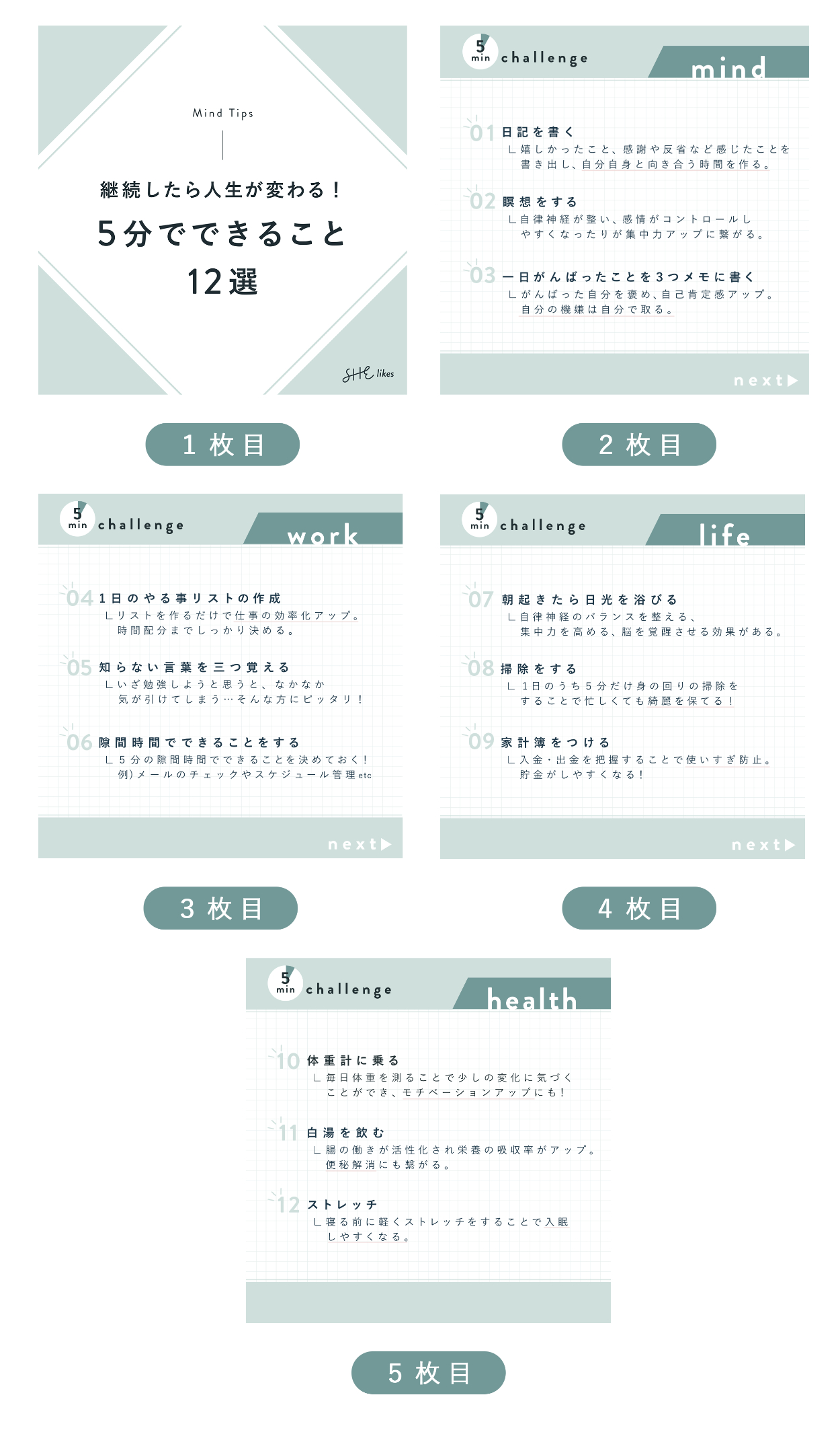 ・5分で継続できることの選定は、ちょっと意識したらできそうという内容にし、わたしでも始められそうと思ってもらいやすい難易度が高くないものをチョイス。