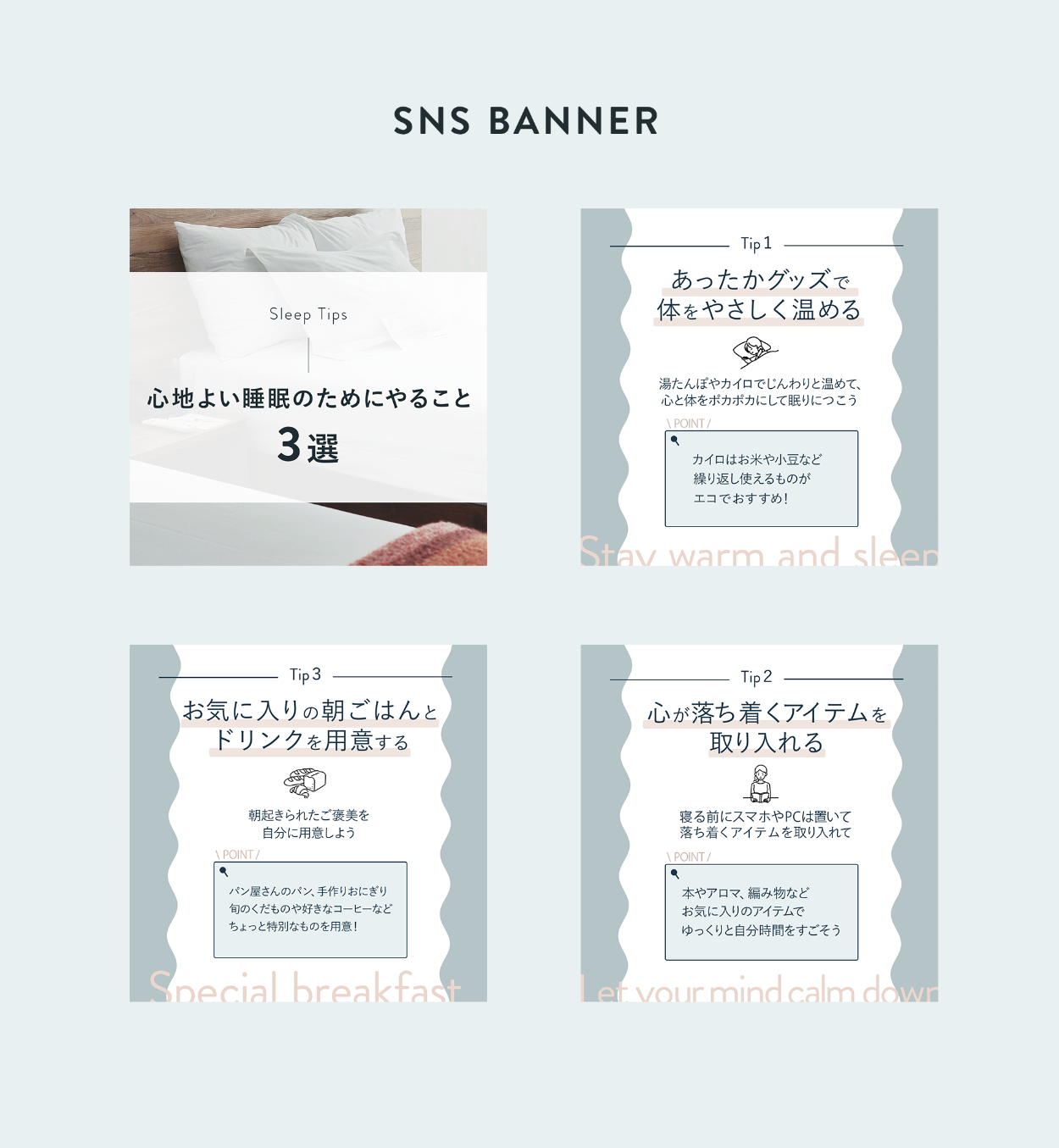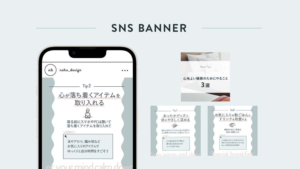 自主制作のInstagram投稿用画像です。(SHElikesのアカウントを想定して制作しています) テーマ:「心地よい睡眠のためにやること3選」