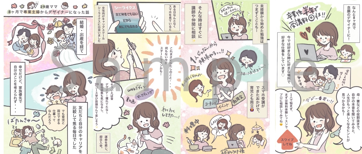 ミレニアム世代に向けたwebスクール SHElikes様の卒業生体験レポートを イラスト漫画にさせていただきました!