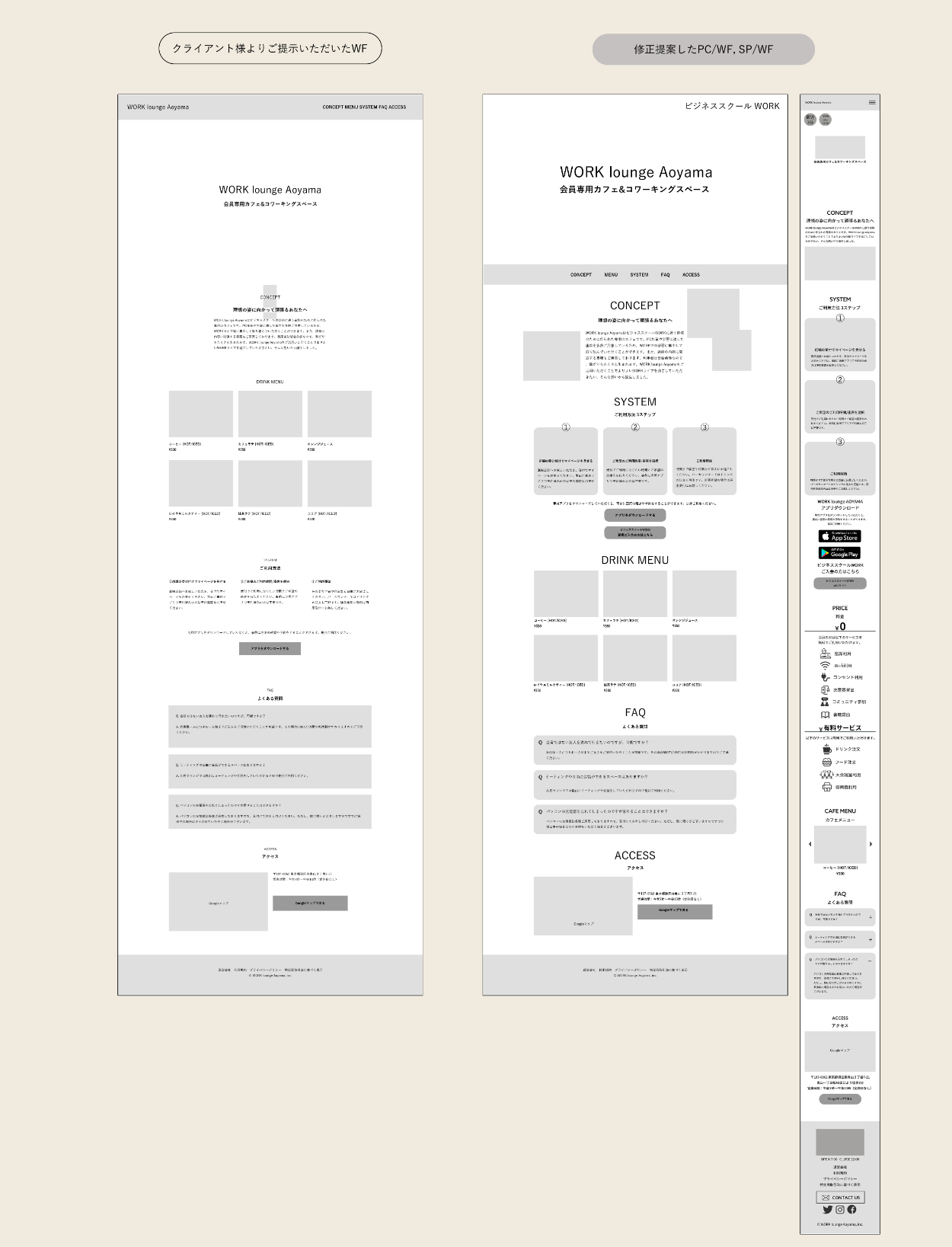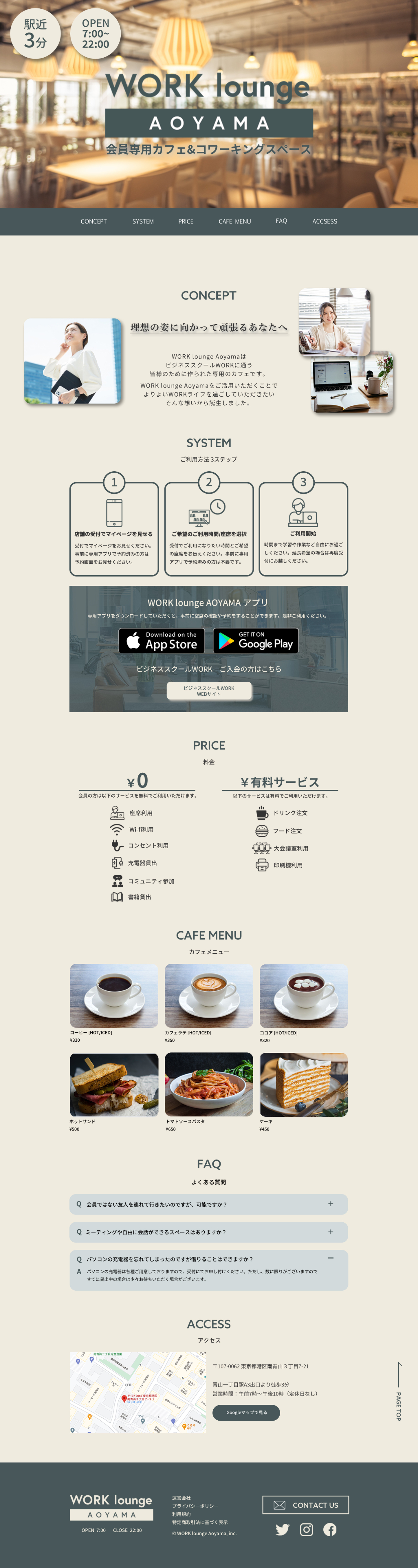 カフェ&コワーキングスペースのLPということで、カフェでありながらもビジネスシーンなどで使う場所ということから全体的にカジュアルになりすぎず、しかし親しみやすく、という部分にこだわり、ビジネスパーソンが使う落ち着いたカフェ、というテーマでトンマナを決めました。