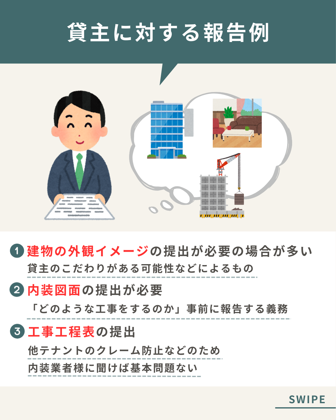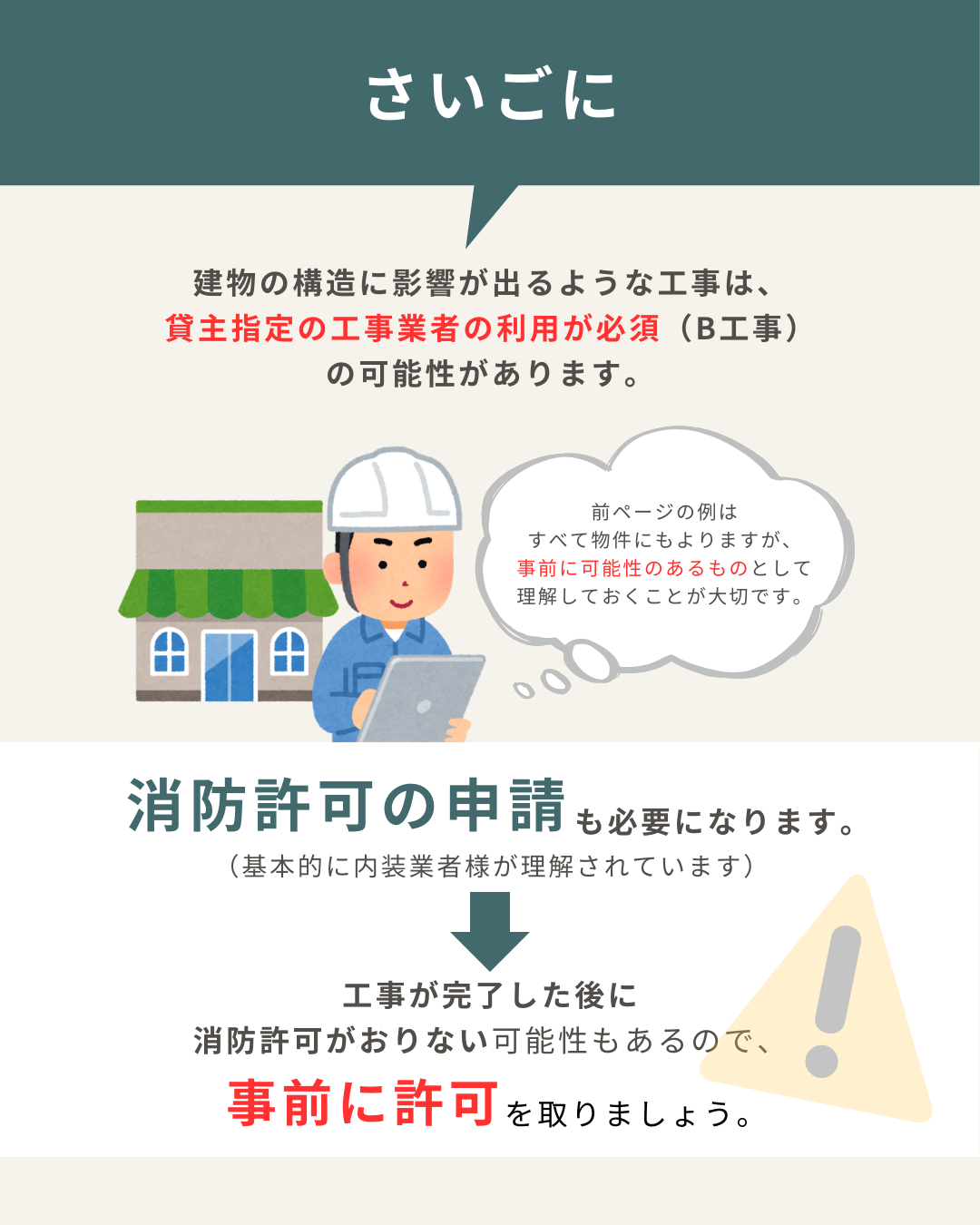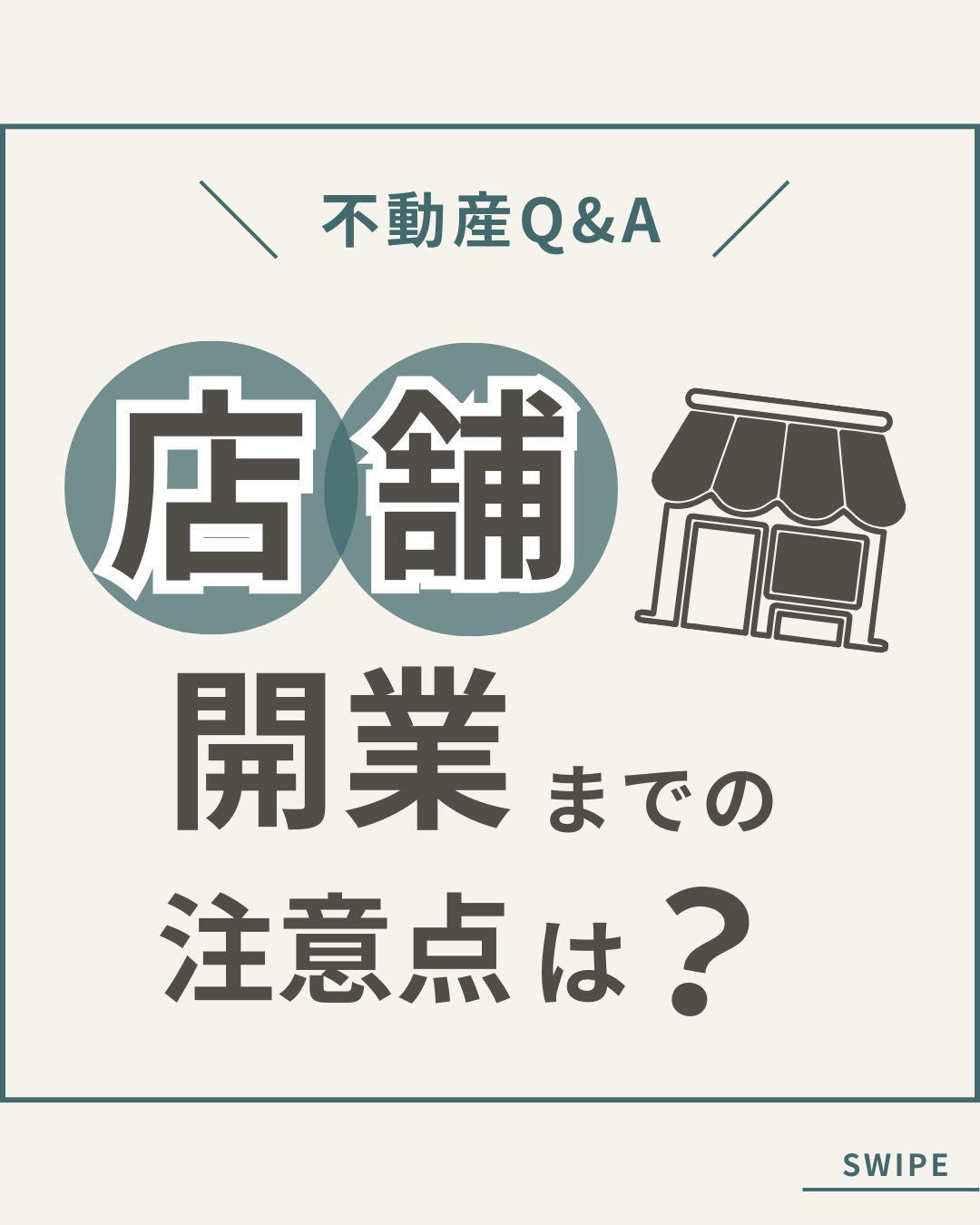 不動産会社様の公式Instagramで投稿するSNSバナーを制作しました。 『店舗開業までの注意点は?』をテーマに、デザイン(イラスト選定)まで行いました。