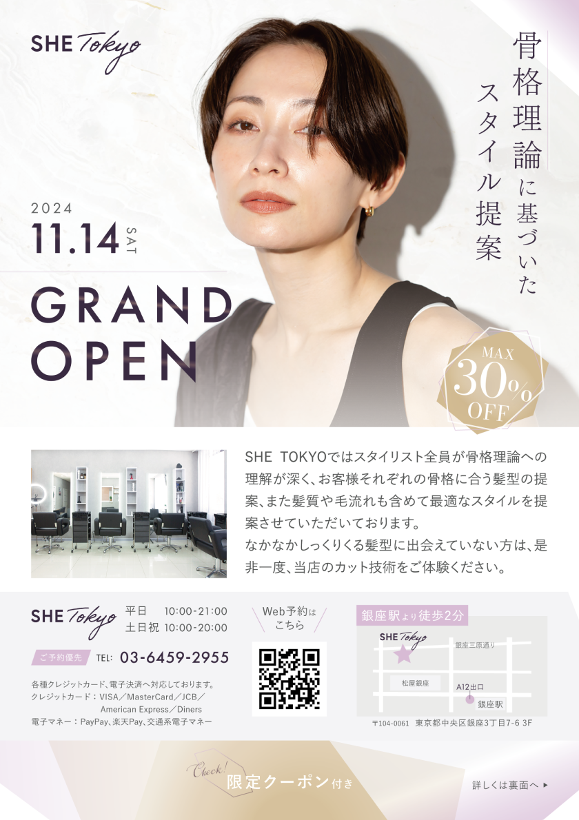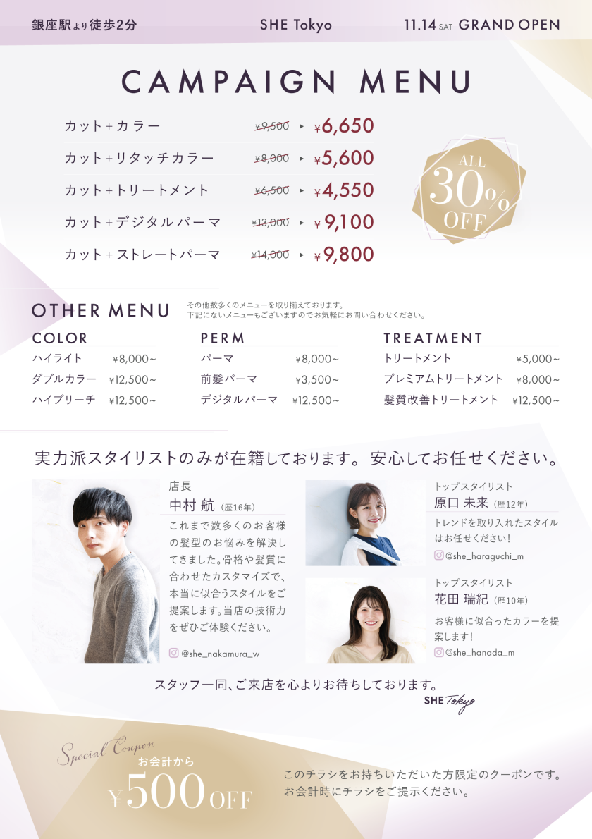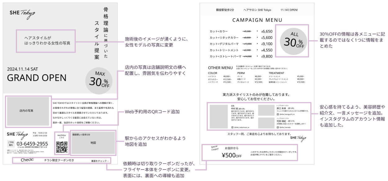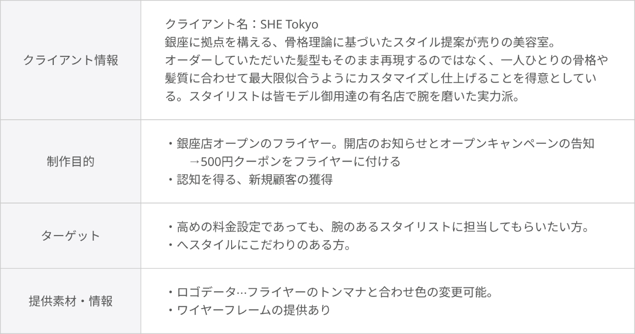 SHElikes PRO デザイナーコースの課題。銀座に新規オープンする美容室のフライヤーを制作しました。ペルソナの設定・ワイヤーフレーム修正から配色検討、Illustratorでのデザイン制作までを一貫して行いました。