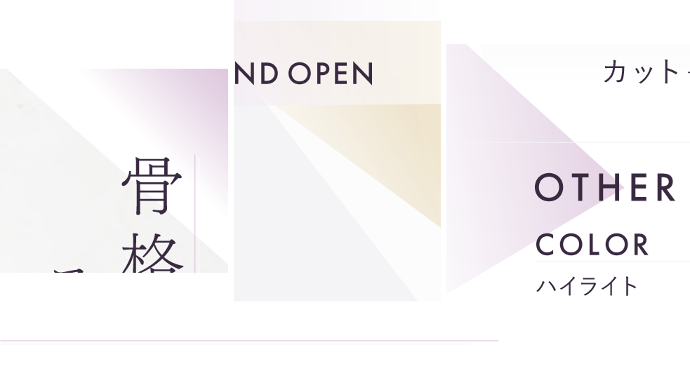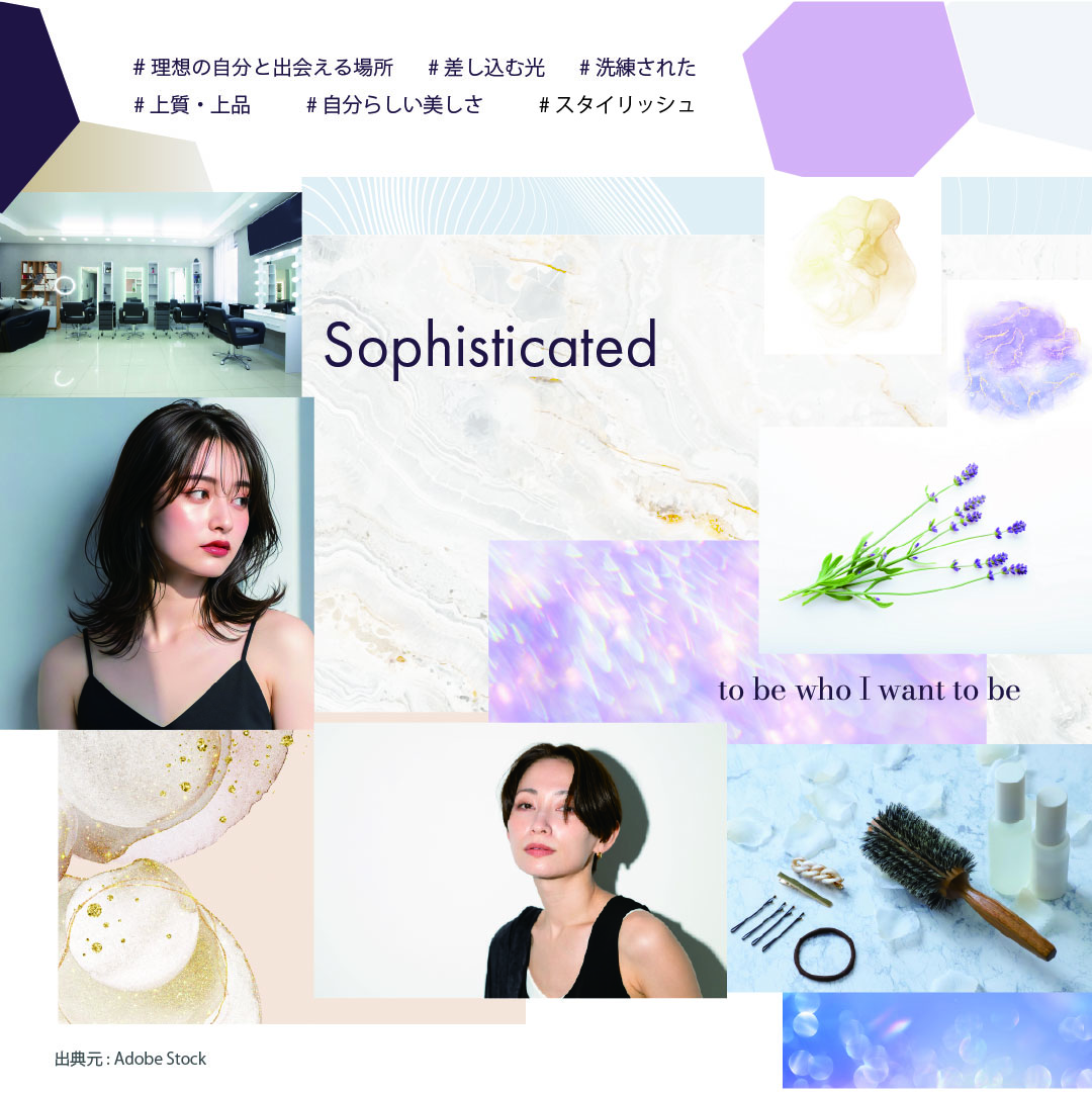 デザインコンセプトは「理想の自分と出会える、光差す美容室」です。洗練された上品さを表すラベンダーをメインカラーに、上質さや理想を叶えるワクワク感をイメージした落ち着いたゴールドカラーをアクセントにしました。
