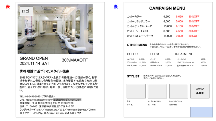【フライヤー制作】架空ヘアサロンの新規開店フライヤー | 実践課題