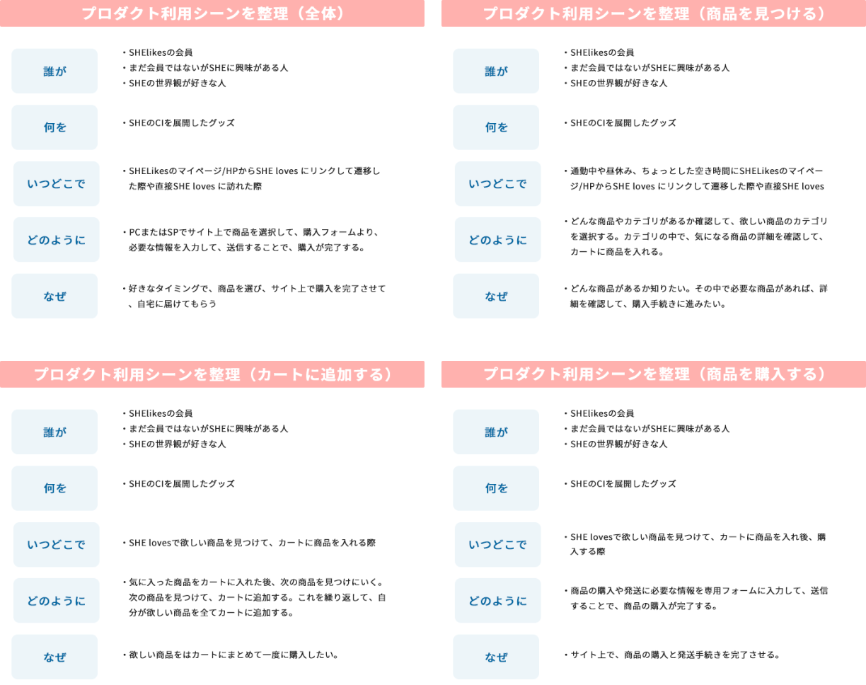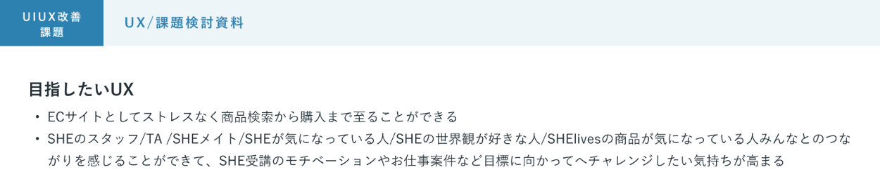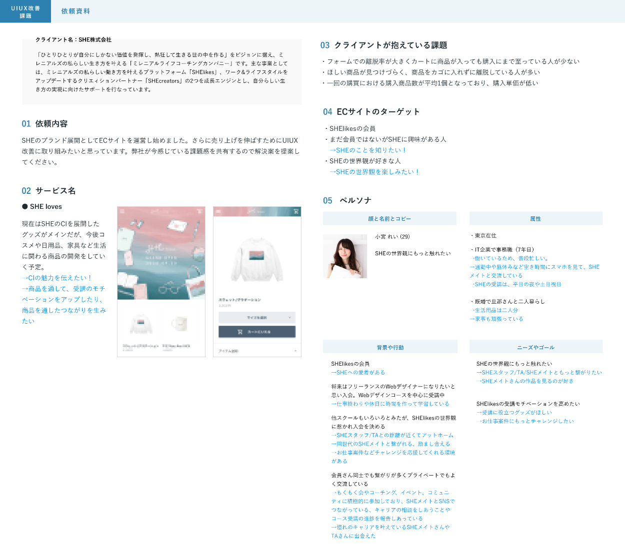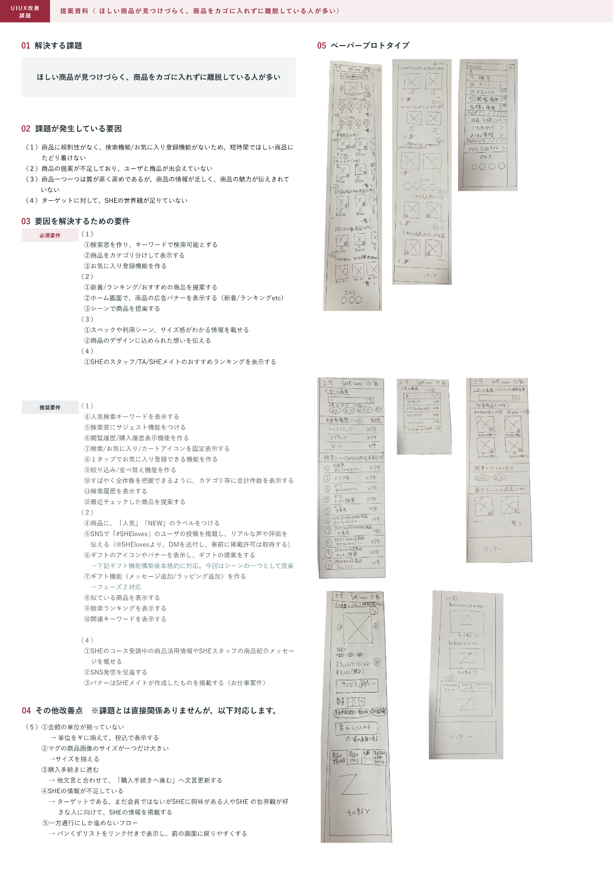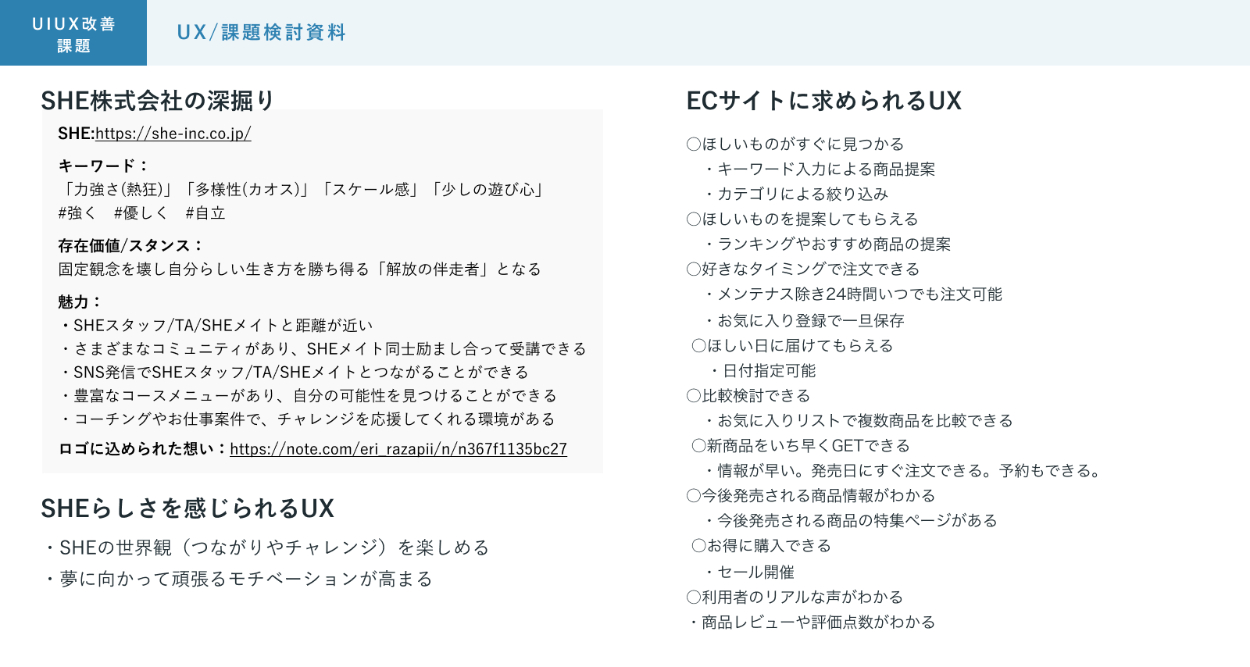 この結果、クライアントからの課題に対する解決策について、目標とするUXを踏まえて他社サイトやSHEらしさから見つけたいろいろなアイデアで提案資料を作成することができた。