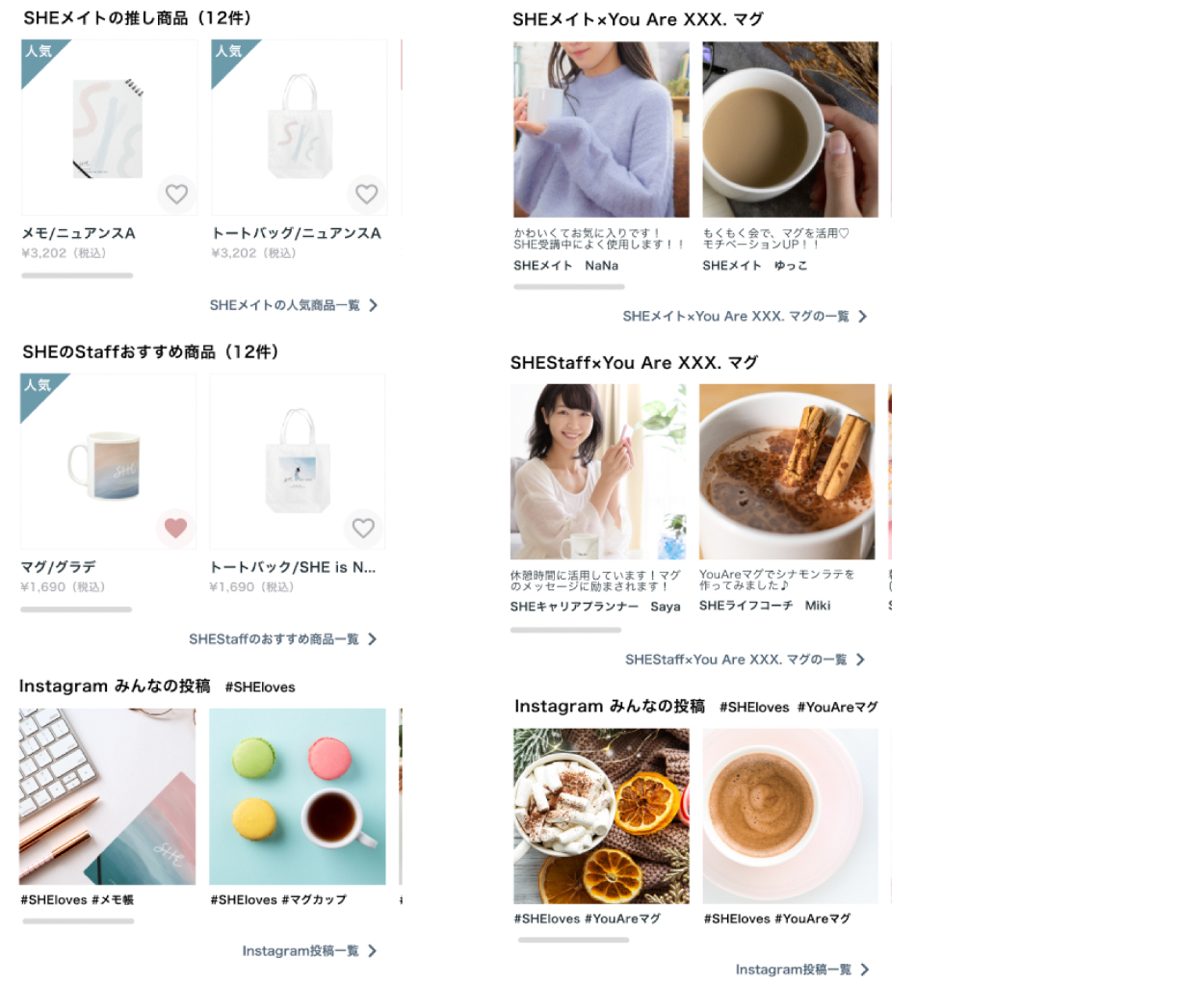 ・ホーム画面に、SHEStaffのおすすめ商品一覧/SHEメイトの推し商品一覧を表示し、商品詳細画面に、SHEStaff×商品/SHEメイト×商品の紹介記事を載せることで、SHEの雰囲気や商品の魅力を伝える。