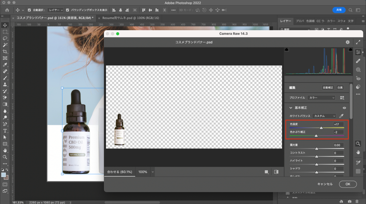 ・メイン写真の青みに近づけるため、CameraRowフィルターを使用し、色温度を青寄りに調整しました。
