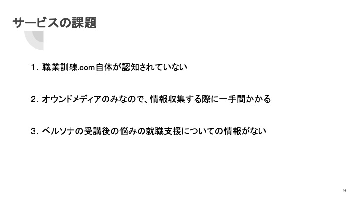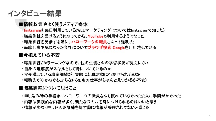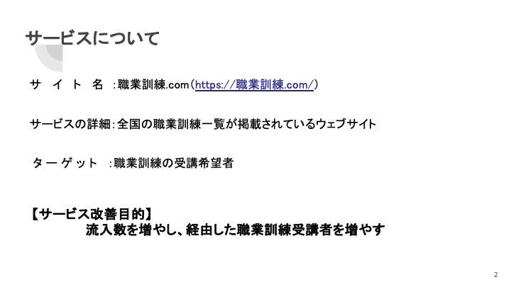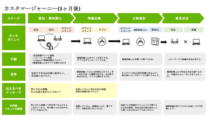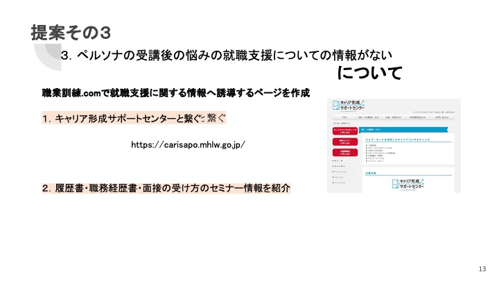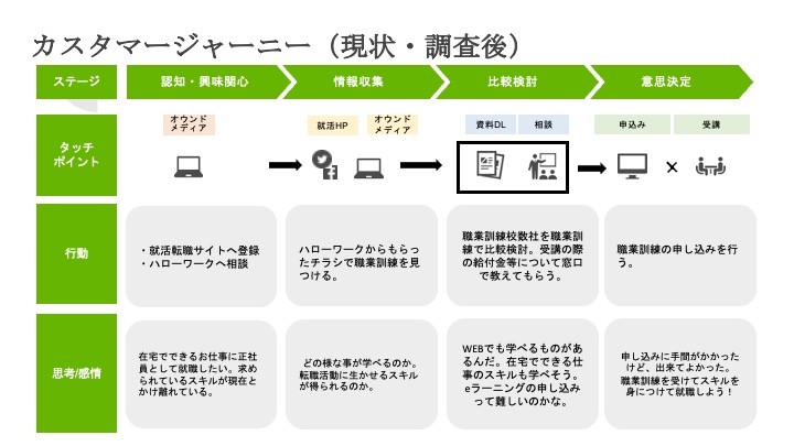 ユーザー調査報告書 あんちん 課題制作&自己制作 OVERVIEW 職業訓練.comというサイトの流入者を増やし、そのサービスを経由した、職業訓練申込者を増やすため、ペルソナ設定→ペルソナへのインタビュー→カスタマージャーニーの作成を行い、今後のサービスの提案まで取りまとめました。 YEAR 2023