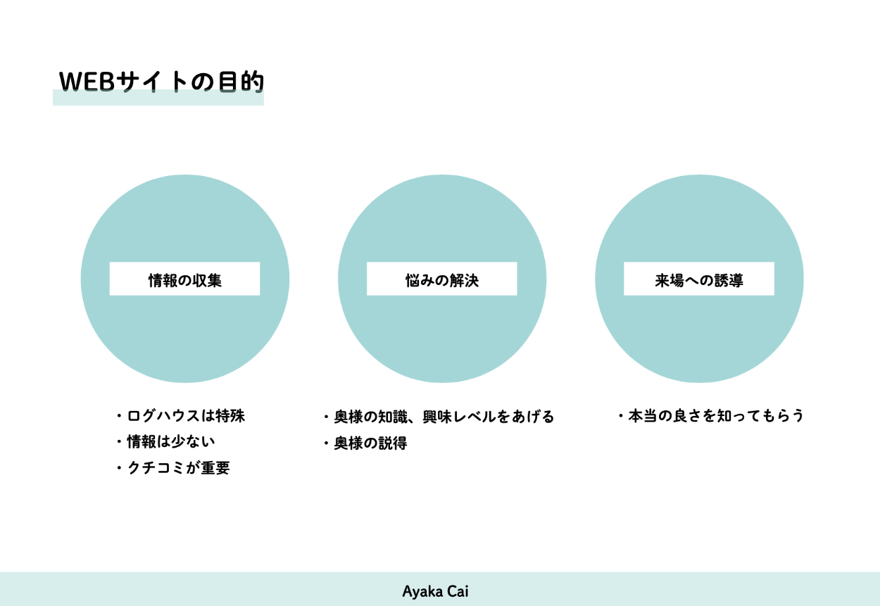- 奥様がサイトを見ることも想定し、予算やログハウスでの暮らしのイメージ写真を多数配置。