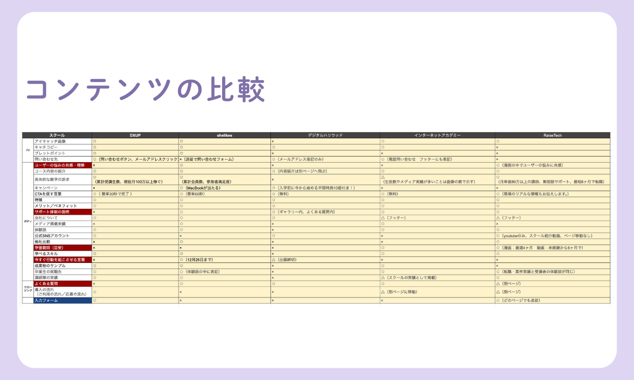 自社・他社LPともに重要なコンテンツを書き出し、表記内容などを比較