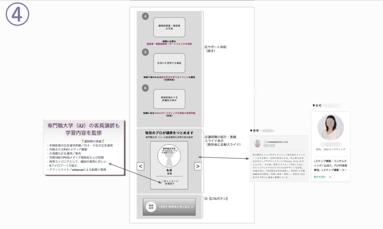 ペルソナの興味を引くブレットポイントやキャッチコピーを設置(受講料0円など) - ファーストビューは笑顔の女性の画像を使用することでターゲット層に親近感を与える