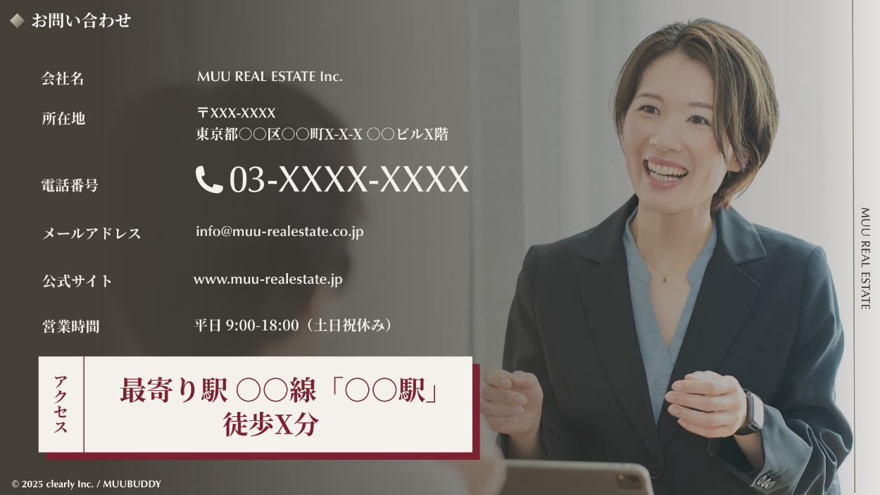 お問い合わせをしたくなる雰囲気やメリハリを意識して作成しました。背景には女性コンサルタントが笑顔で商談しているイメージの写真を配置し、安心感を与えたいと考えました。また情報の強弱については、メインの問い合わせかと考えられる電話番号を大きくし、アクセスについても実際に訪れる際に重要な情報だと思うので目に留まるように配置をしました。