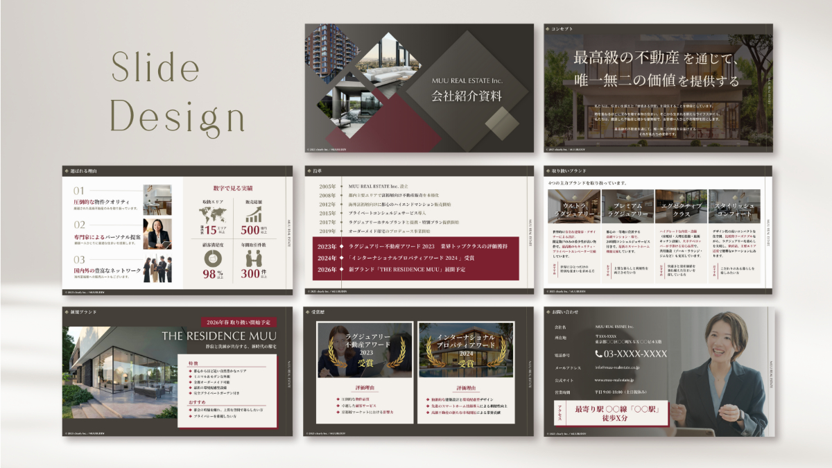 全体のモチーフとして決めたひし形を使い、全体の統一感を出しました。また写真も載せることで、取り扱う不動産の雰囲気や高級感を伝えられたらと考えています。全体のデザインとしてはシンプルに抑えて、上品さや「会社紹介資料」のタイトルに目が留まるようにしました。