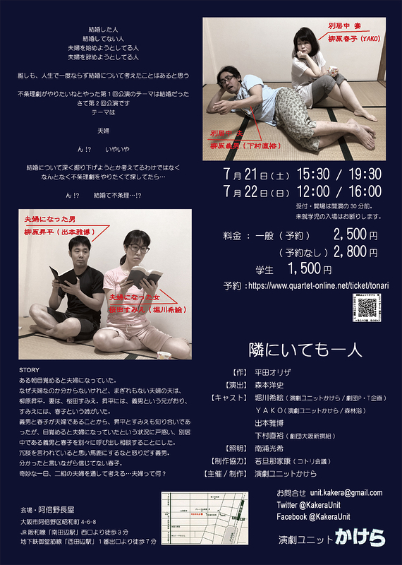演劇ユニットかけら 第2回公演『隣にいても一人』 Hiroshi Morimoto OVERVIEW 2018年7月 演劇ユニットかけら第2回公演『隣にいても一人』の演出として参加 YEAR 2018 演劇ユニットかけら 第2回公演『隣にいても一人』作:平田オリザ演出:森本洋史日時:2018年7月21日(土) 15:30 / 19:307月22日(日) 12:00 / 16:00会場:レンタルスペース阿倍野長屋演劇ユニット かけら HPCoRich舞台芸術!「隣にいても一人」