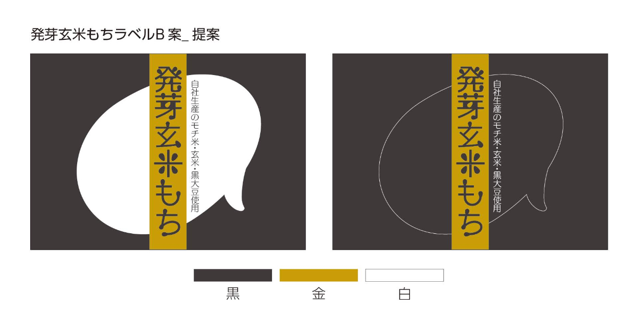 別案として出したB案では発芽玄米のシルエットを大きめにして視認性を高め、色で高級感を表現しました。